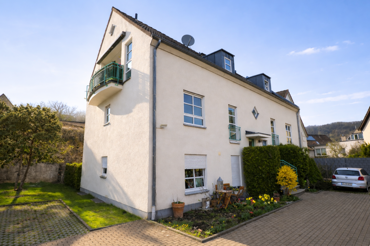 Am Ende einer Sackgasse und zurückversetzt von der verkehrsberuhigten Anliegerstraße befindet sich diese gepflegte 3-Zimmer-Eigentumswohnung im Dachgeschoss eines ebenso gepflegten 5-Familienhauses.