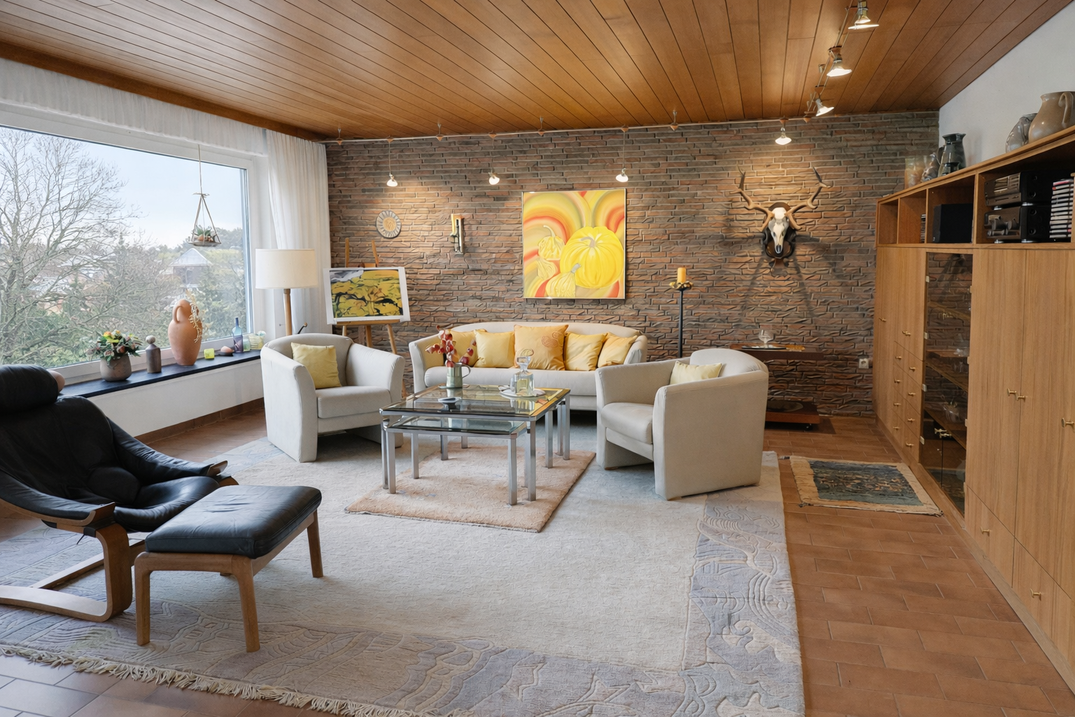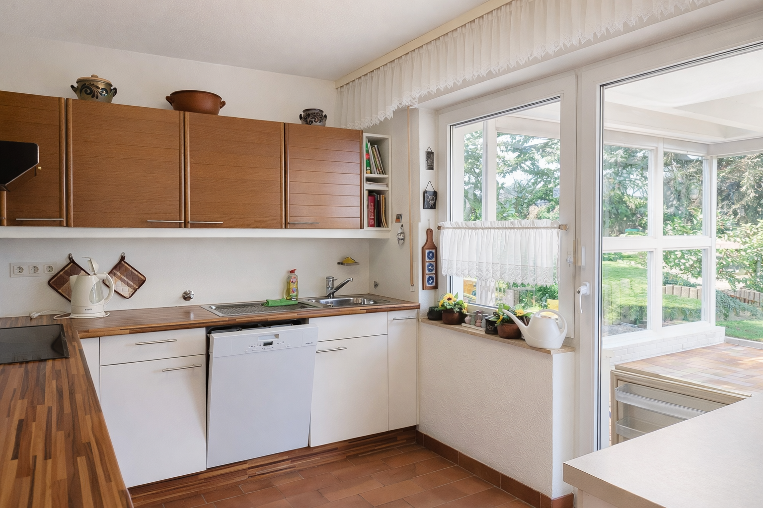 Vom Hausflur aus liegt rechts das Büro/Arbeitszimmer, links das Gäste-WC. Weiter geradeaus befindet sich auf der rechten Seite die gemütliche Bar, dann das Tageslichtbad mit Wanne und Glasdusche sowie ein Zimmer, nutzbar als Schlafzimmer oder Esszimmer. Der sehr üppige Wohn- und Essbereich, links gelegen, mit der angrenzenden Küche gewinnt noch zusätzlich mit dem traumhaften Blick in den wunderschön angelegten Garten.