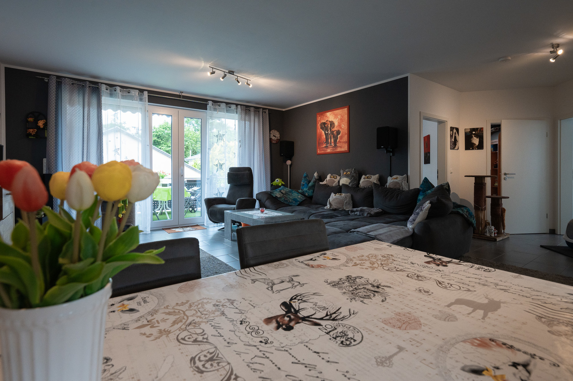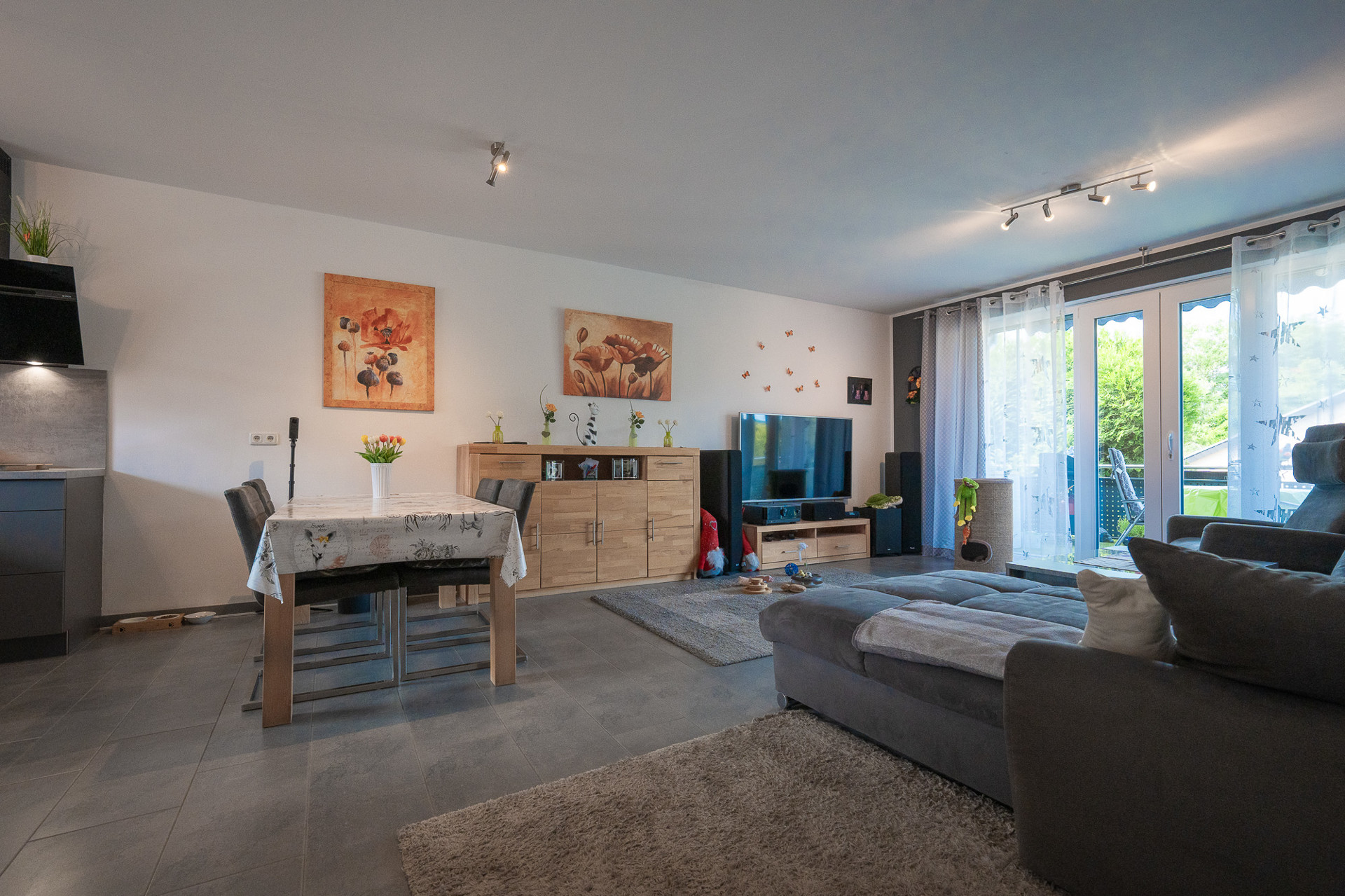 – Offener Wohn-, Ess- und Kochbereich mit Zugang zum überdachten Balkon (Rückseite, sehr ruhig)