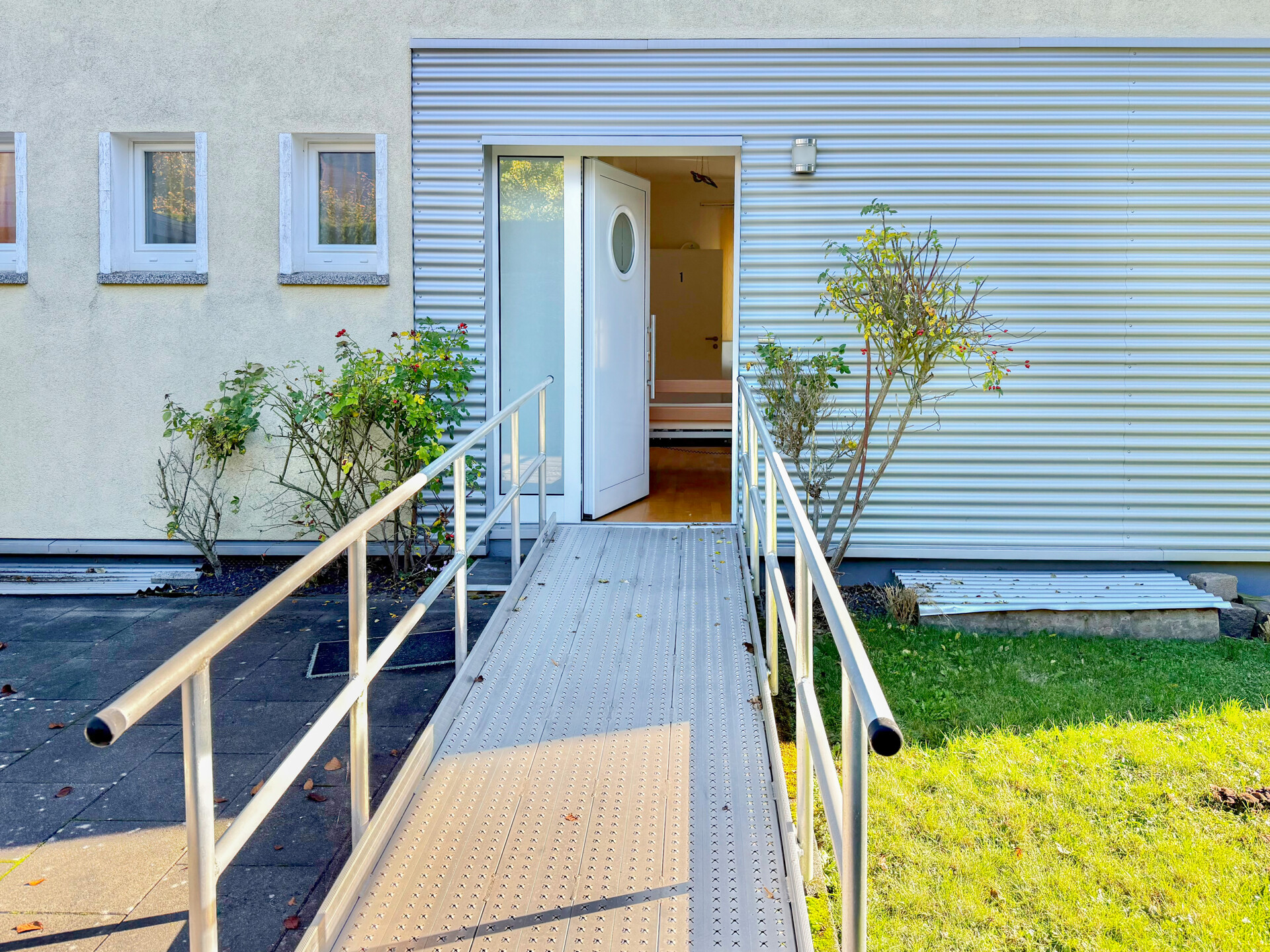 Stufenlose Zugänge + zwei Rampen, barrierefreie Räume und Bäder