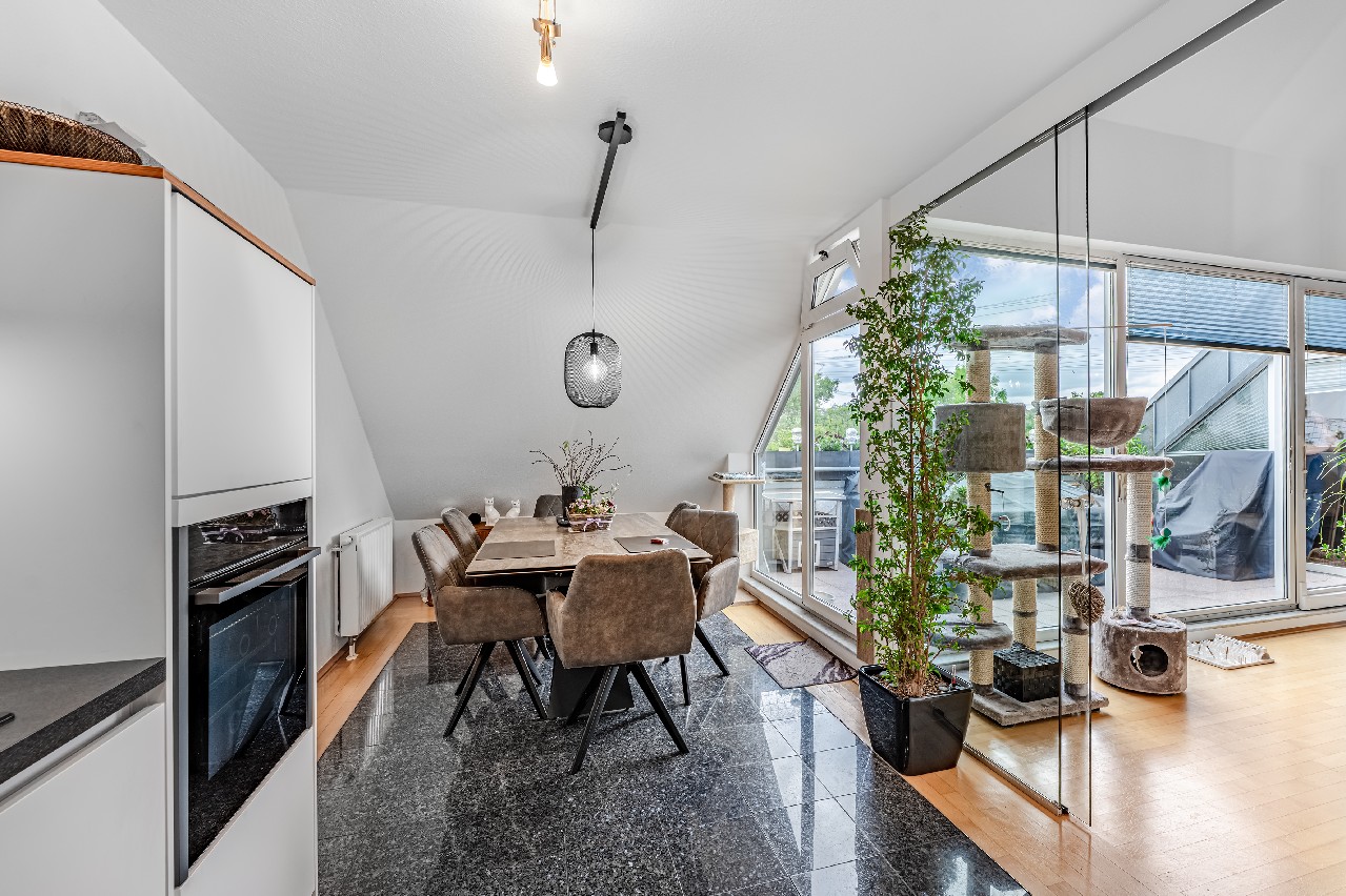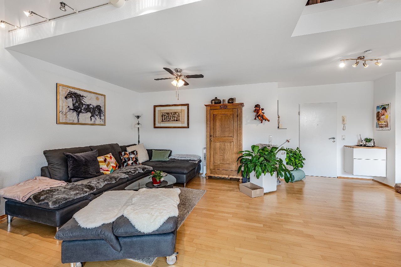 Diese Maisonette-Wohnung erstreckt sich über das 2. Obergeschoss sowie das ausgebaute Galeriegeschoss einer gepflegten Wohnanlage am Rande eines Naturschutzgebiets. Mit einer Wohnfläche von ca. 107 m², zwei Balkonen, einer beeindruckenden Raumhöhe durch die offene Galerie und einer hochwertigen Ausstattung bietet diese Immobilie außergewöhnlichen Wohnkomfort – sowohl für Kapitalanleger als auch für Eigennutzer mit Anspruch. Der Zugang zur Wohnung erfolgt über das 2. Obergeschoss. Hier eröffnet sich ein großzügiger Wohnbereich mit Zugang zum großen Balkon in Westausrichtung. Über ein großes Schiebetürelement gelangen Sie ins Freie. Die Küche und der Essplatz sind durch eine elegante Glasschiebetür vom Wohnraum separiert. Die moderne Einbauküche wurde erst im vergangenen Jahr von