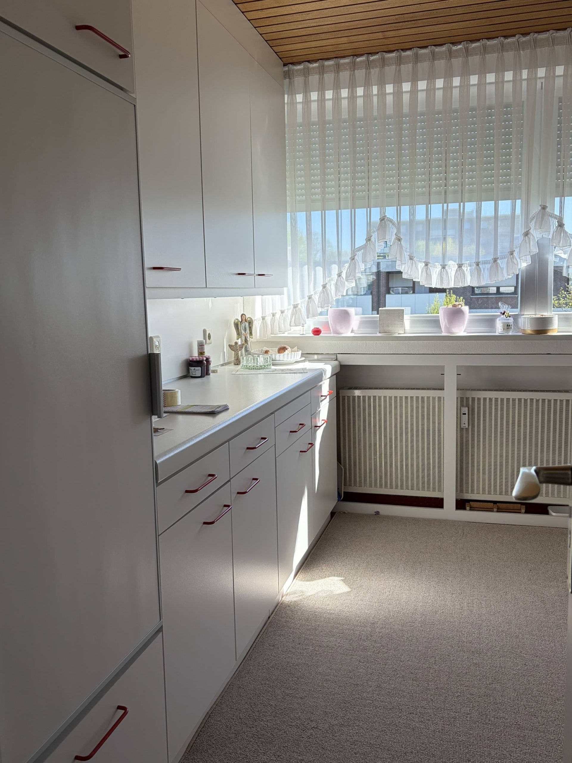 • Die Wohnung präsentiert sich hell und gepflegt. Zur Ausstattung zählen u.a. Teppichboden in allen Räumen, Raufasertapeten, doppelt verglaste Aluminiumfenster mit Außenrollos (teilweise elektrisch), Loggia mit Markise, weiße Holzdecken sowie Innentüren und eine moderne Wohnungseingangstür. Das Badezimmer stammt aus dem Baujahr, wurde jedoch optisch etwas überarbeitet. Es ist mit weiß gestrichenen Fliesen, einer Badewanne sowie einem Bidet ausgestattet.