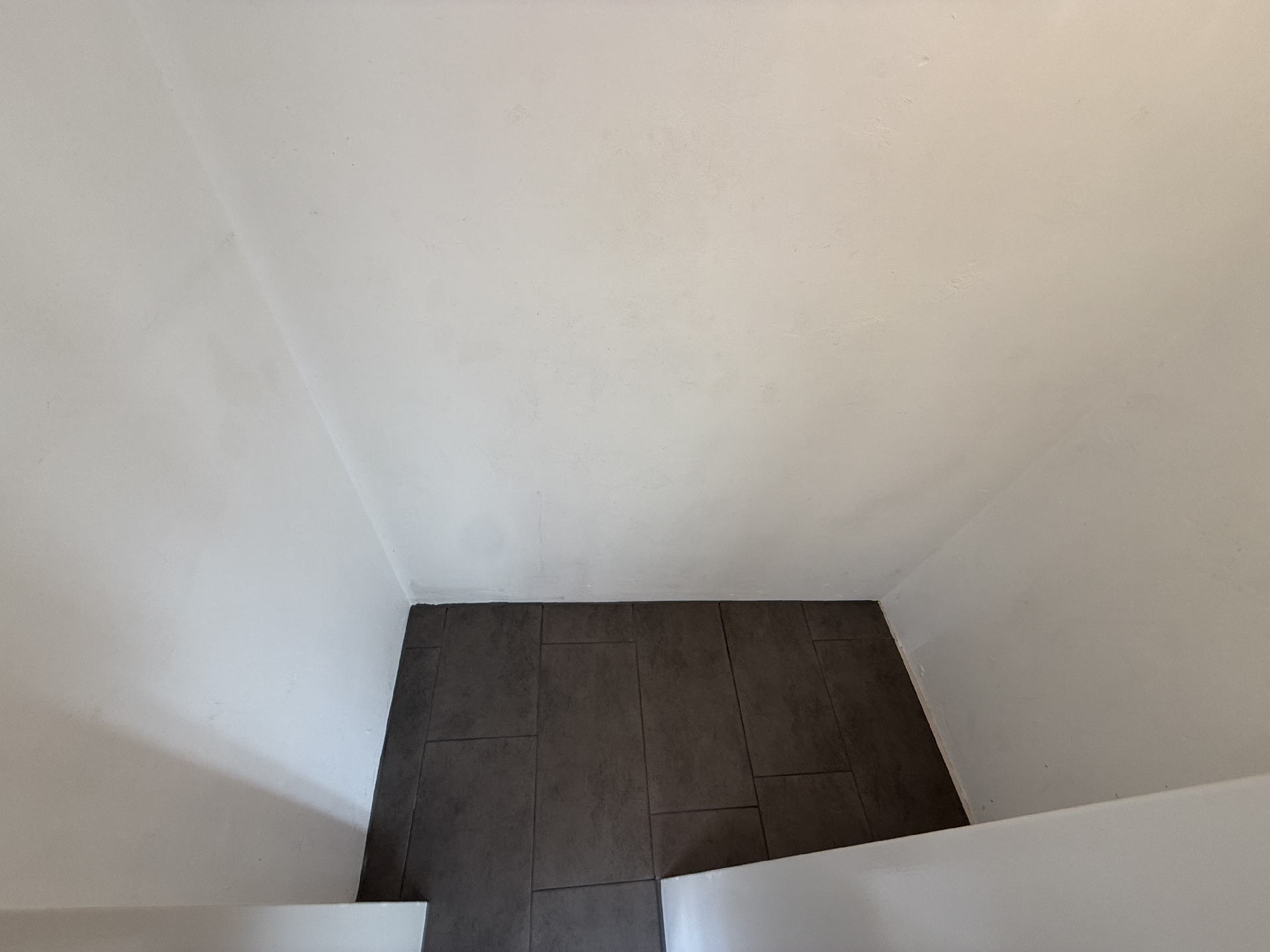 • – graue Bodenfliesen in Flur, Abstellraum und Kochnische