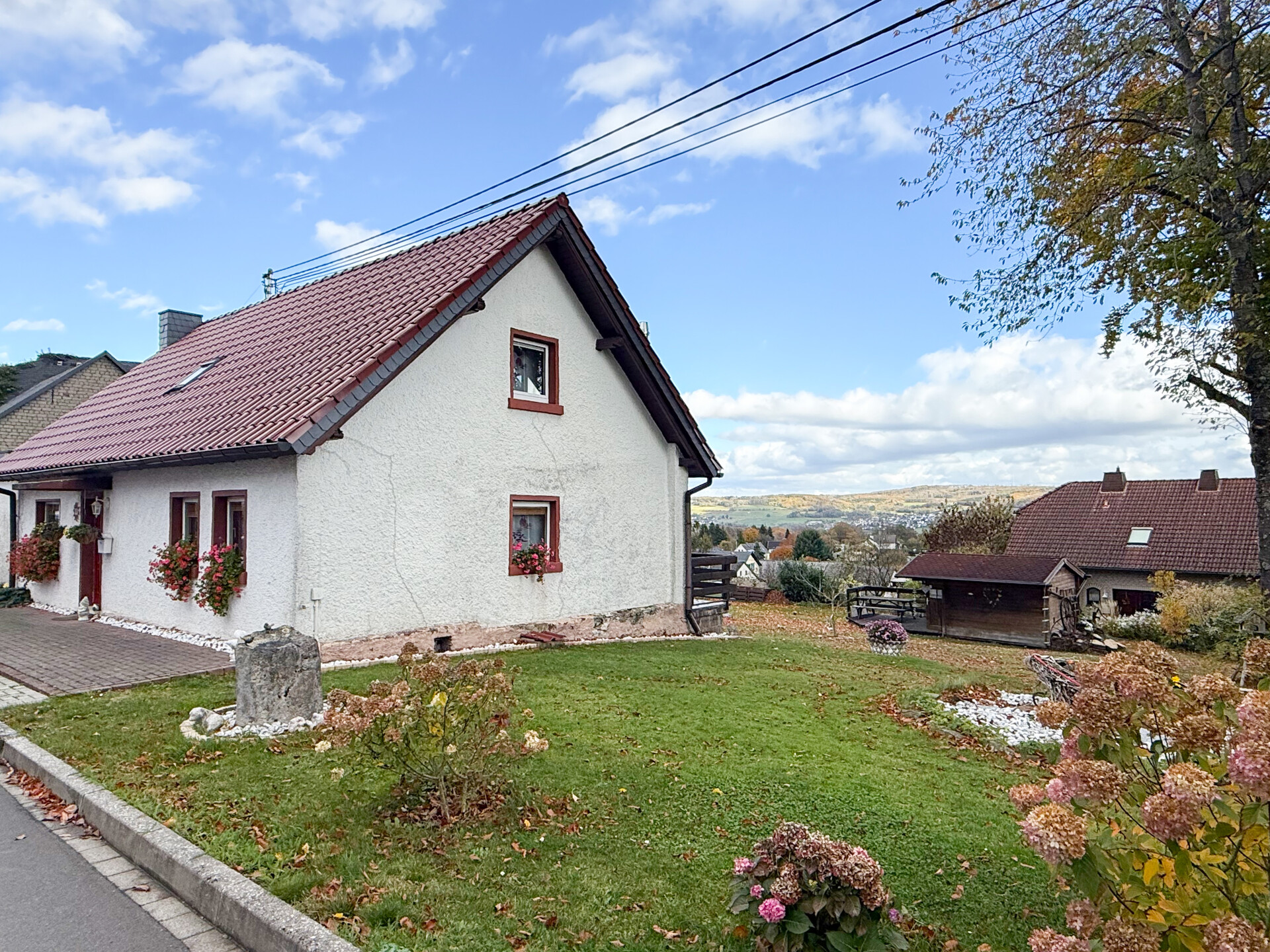 Dieses charmante Einfamilienhaus aus ca. 1914 befindet sich in herrlicher Höhenlage auf einem großzügigen Grundstück von rund 1.219 m², das sich bei Bedarf auch in einen separaten Bauplatz aufteilen ließe. Das Haus präsentiert sich gepflegt und bietet eine Wohnfläche von etwa 132,41 m², die sich über Erd- und Dachgeschoss erstreckt. Im Erdgeschoss empfängt Sie ein großer Wohnbereich mit Kaminofen, von dem aus Sie sowohl den Balkon als auch den Garten erreichen. Das Esszimmer liegt direkt neben der Küche, welche ebenfalls über einen Zugang zum Balkon verfügt. Ein helles Tageslichtbad mit Wanne und Dusche sowie ein weiteres Zimmer, vervollständigen diese Ebene. Die Raumaufteilung ermöglicht komfortables Wohnen auf einer Ebene und eignet sich damit auch hervorragend für das Wohnen im Alter. Im Dachgeschoss stehen zwei Schlafzimmer und ein kleiner Raum, der sich als Büro oder Abstellfläche eignet, zur Verfügung. Der Spitzboden bietet zusätzlichen Stauraum. Eine Einzelgarage mit elektrischem Tor sowie ein Kriechkellerraum sind ebenfalls vorhanden. Das gepflegte Grundstück mit Baumbestand, Gartenhäuschen und beeindruckendem Fernblick macht dieses Zuhause besonders attraktiv. Der Ort selbst besitzt eine eigene Kindertagesstätte und eine Grundschule – ideal für Familien.