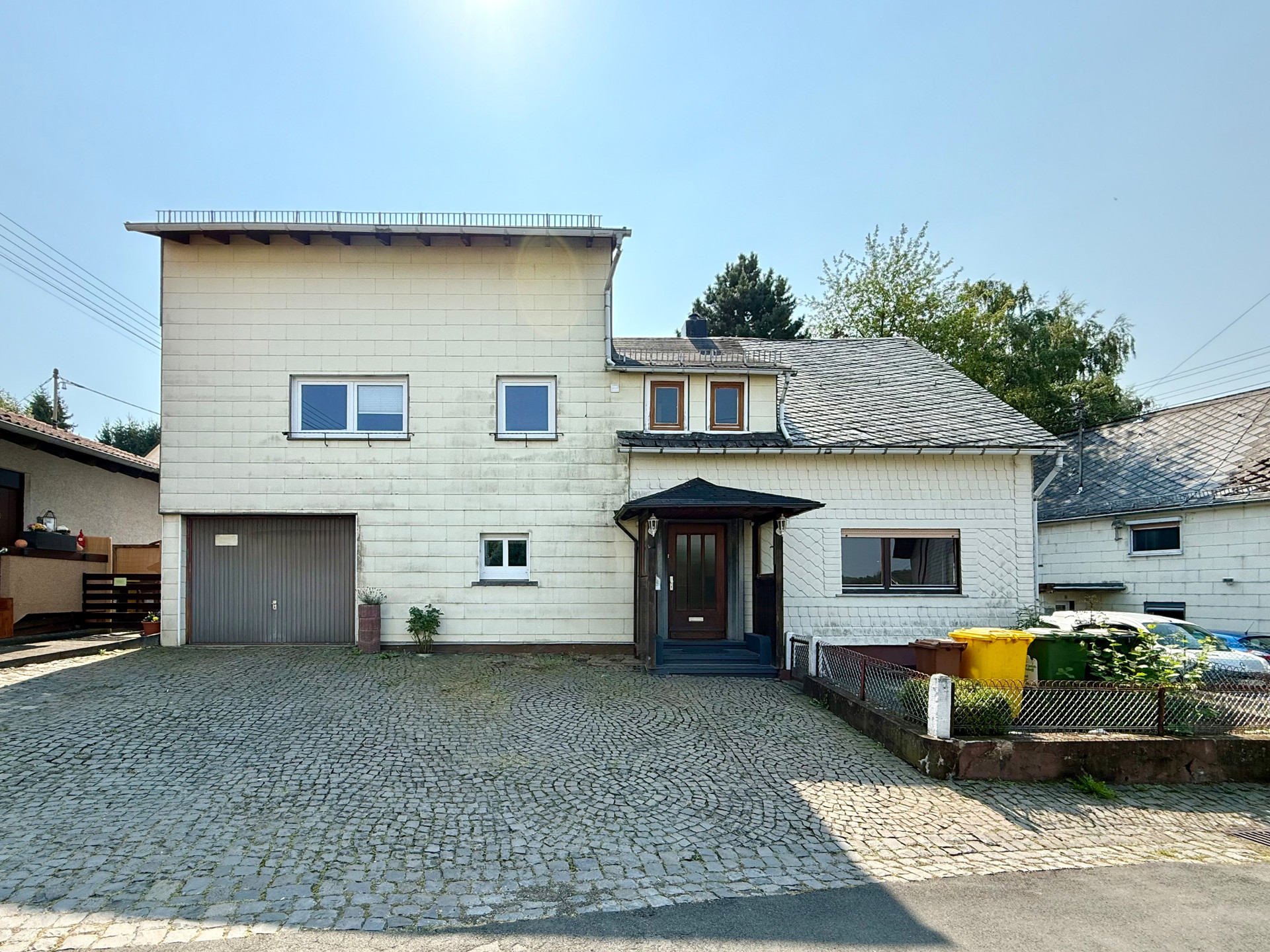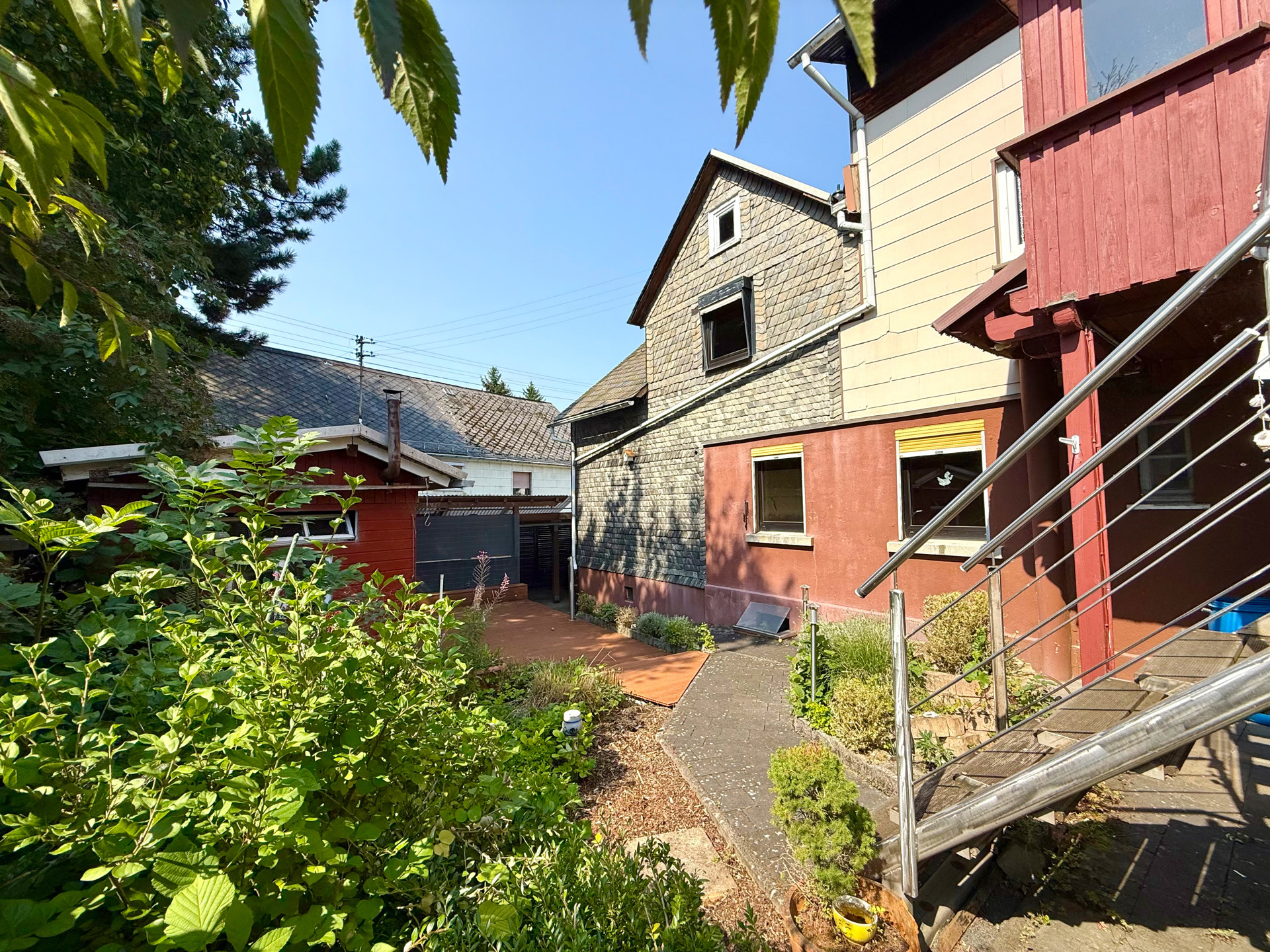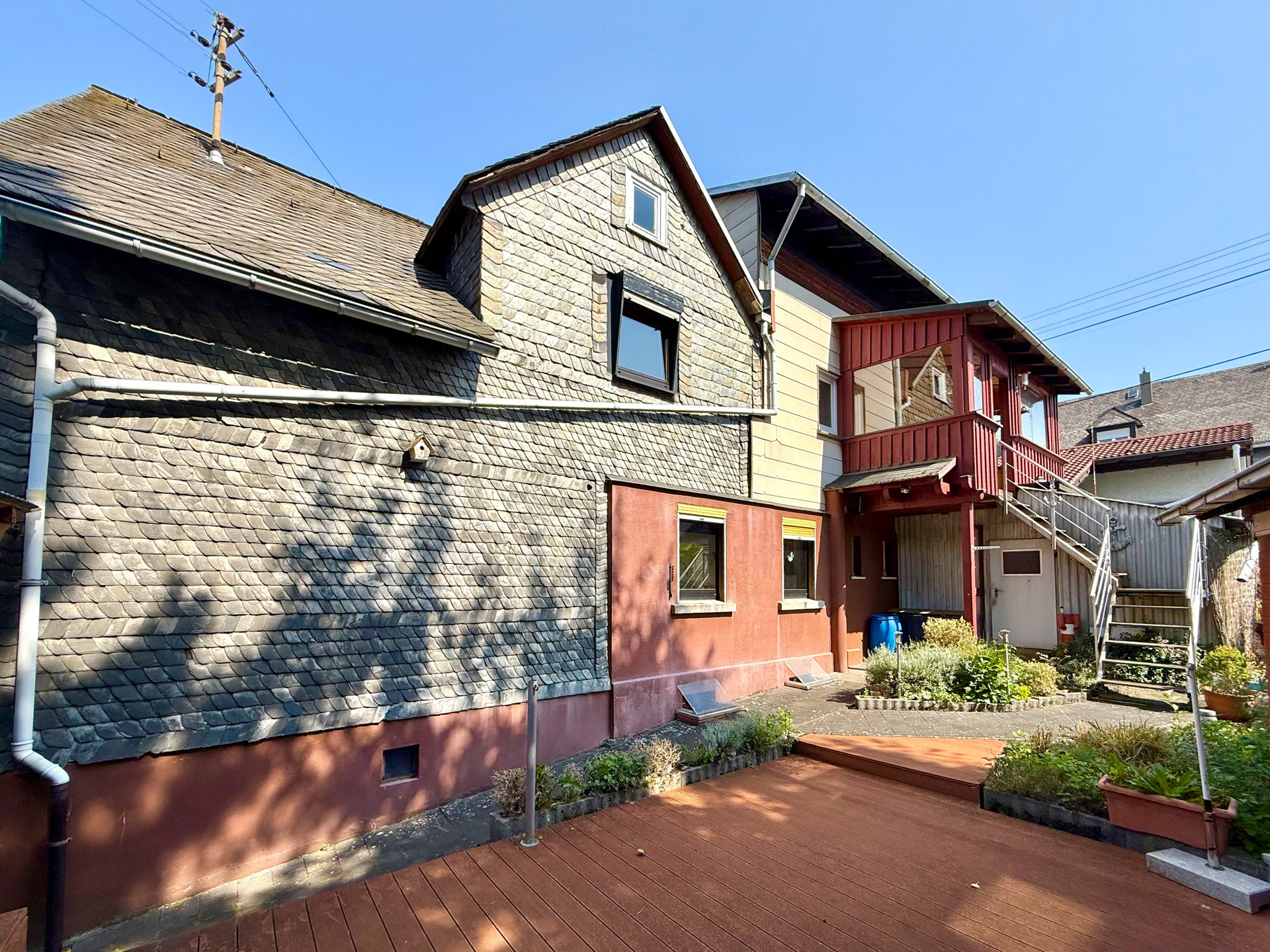 Das ehem. Bauernhaus wurde um ca. 1920 auf einem rd. 425 m² großen Grundstück errichtet und später um weiteren Wohnraum ergänzt. Heute bietet es zwei potenzielle Wohneinheiten, die aktuell miteinander verbunden sind, aber mit entsprechenden Umbaumaßnahmen separat nutzbar wären – Ideal für einen Mehgenerationenhaushalt oder zum Wohnen und/oder Vermieten. Der rechte, ursprüngliche Hausteil befindet sich in renovierungsbedürftigem Zustand und stellt einen Wohn-/Essbereich, eine Küche, ein Bad sowie ein Schlafzimmer zur Verfügung. Der linke Teil ist gepflegt und sofort beziehbar. Diese Einheit besitzt 2 Schlafzimmer, ein Duschbad, eine Ankleide, einen geräumigen Wohn-/Essbereich mit angrenzendem Wintergarten, eine Küche samt EBK sowie zwei Abstellräume. Das pflegeleichte Grundstück bietet eine große Terrasse im hinteren Bereich sowie ein Gartenhaus. Zwei separate Stromzähler sind vorhanden. Der linke Teil ist über das gemeinsame Treppenhaus im Obergeschoss oder über den Wintergarten zugänglich. Das Haus ist teilunterkellert – im Ursprungsteil befindet sich ein Bruchsteinkeller mit drei Nutzräumen. Als Parkmöglichkeit stehen zwei Garagen und 1-2 Stellplätze vor dem Objekt bereit.