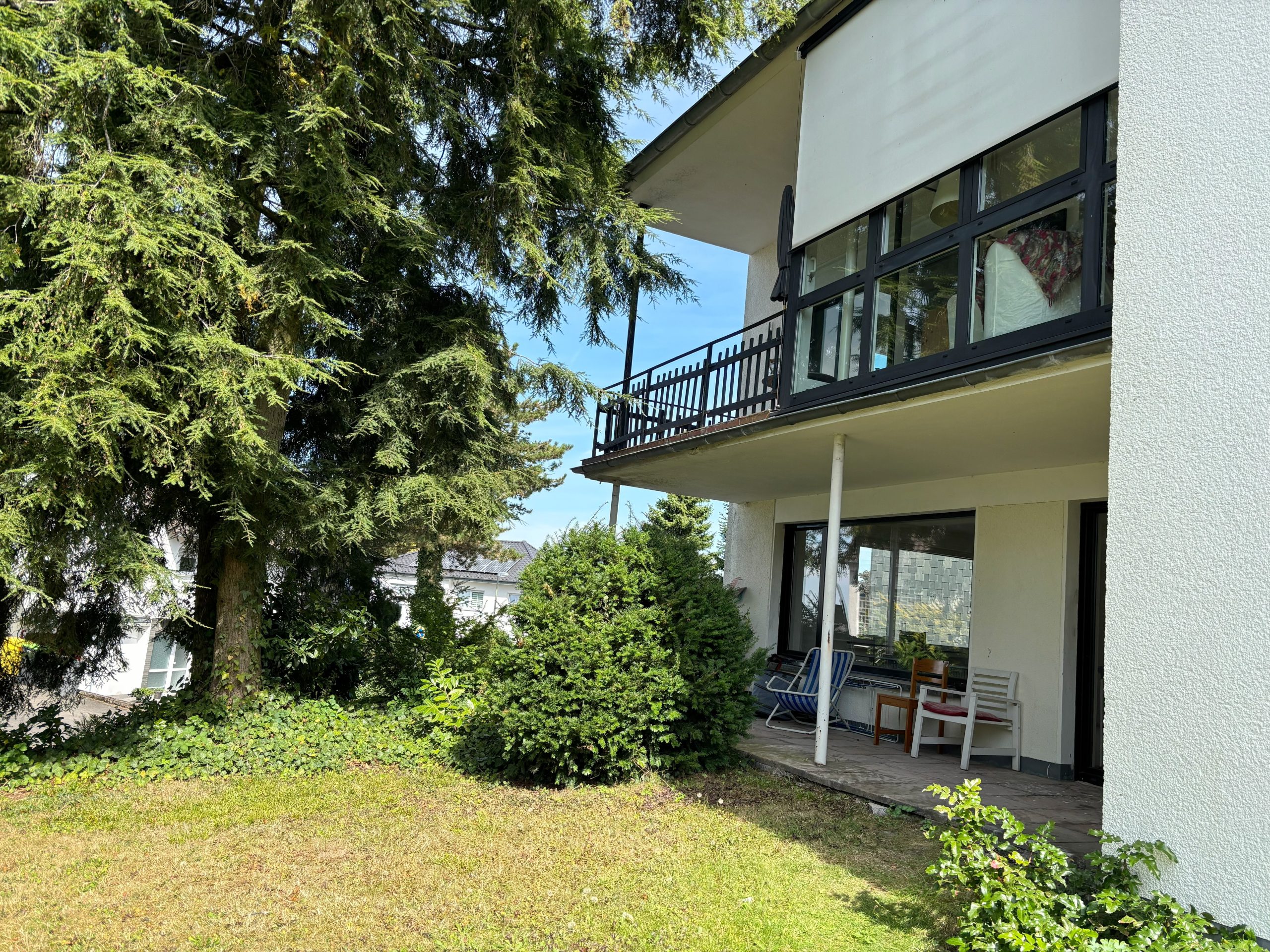 Das Haus steht auf einem großzügigen Eckgrundstück mit pflegeleichtem Garten und altem Baumbestand.