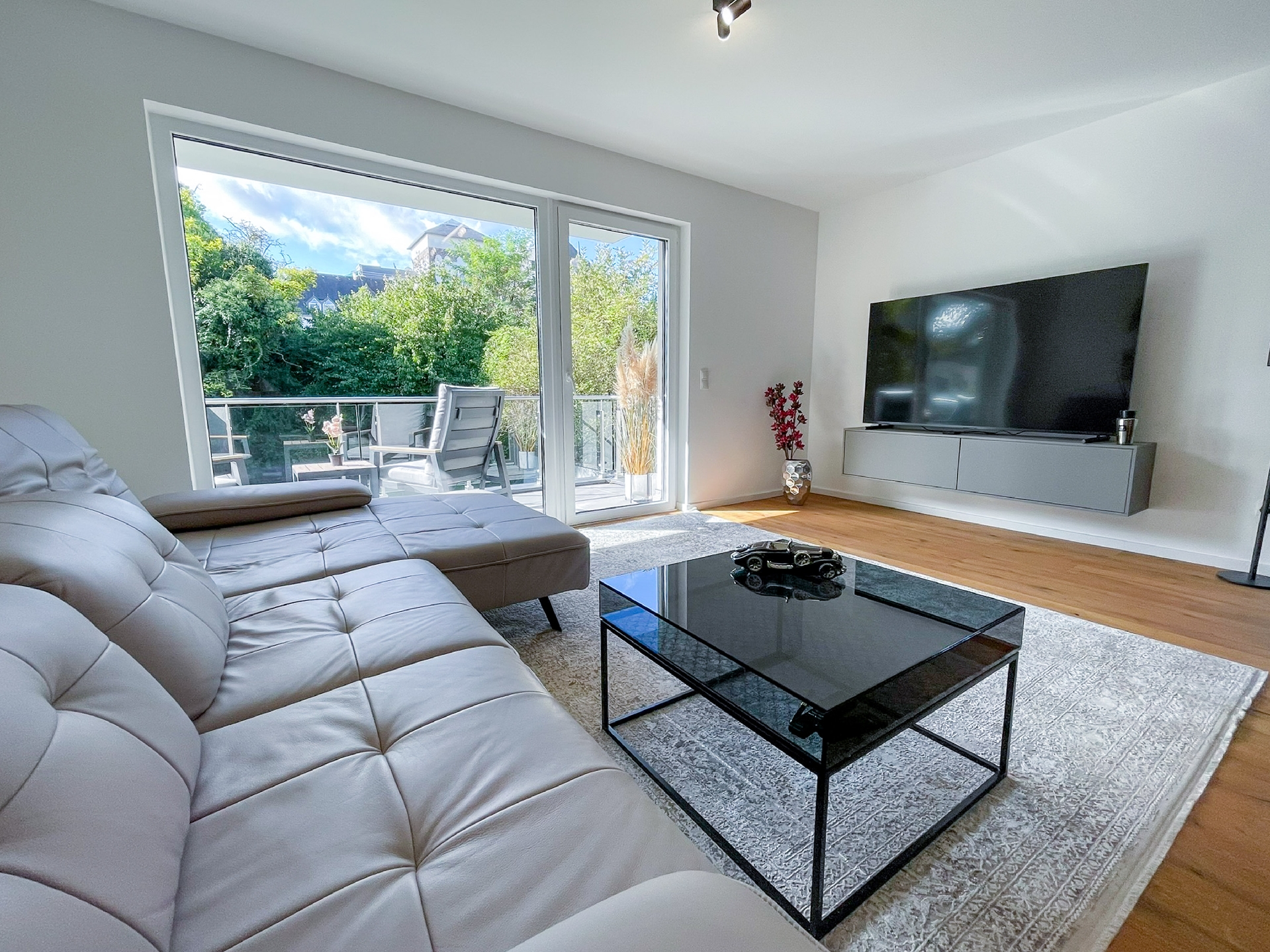 Der großzügige Wohn- und Essbereich mit maßgefertigter Einbauküche ist das Herzstück der Wohnung und bietet direkten Zugang zu einem der beiden Balkone – ideal, um den Blick ins Grüne und die ruhige Umgebung zu genießen. Das Schlafzimmer überzeugt ebenfalls mit Balkonzugang und herrlichem Ausblick. Ein weiteres Zimmer eignet sich perfekt als Kinder-, Gäste- oder Arbeitszimmer.