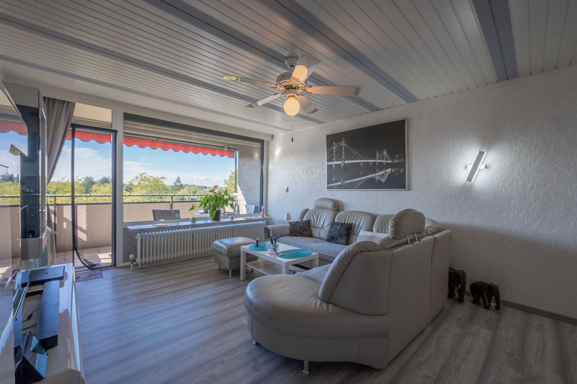 – Großzügiger Wohnbereich mit Zugang zum überdachten Balkon und Weitblick – perfekter Ort zum