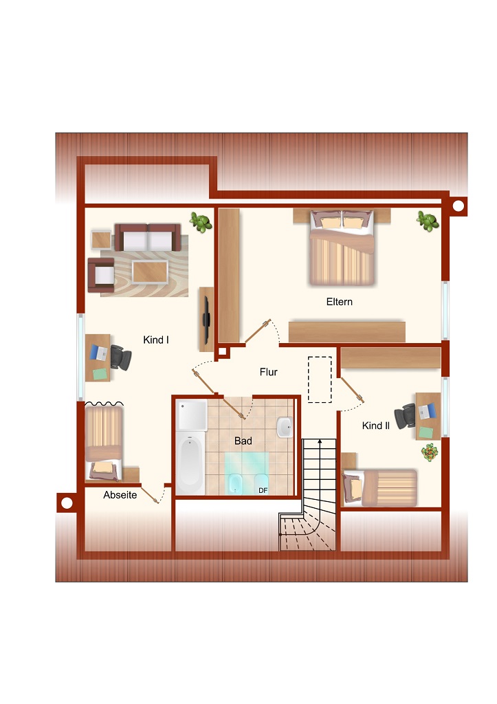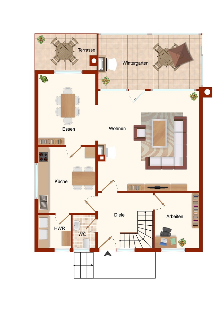 • Im Erdgeschoss befinden sich ein großer Wohnbereich mit vorgelagertem Wintergarten (17 m², nicht in der Wohnfl. enthalten), ein schöner Essbereich mit Zugang zu Küche und Wohnzimmer sowie kleiner Hauswirtschaftsraum, Gäste-WC und Büro. Das DG verfügt über 3 Schlafzimmer sowie ein Wannen-/Duschbad.
