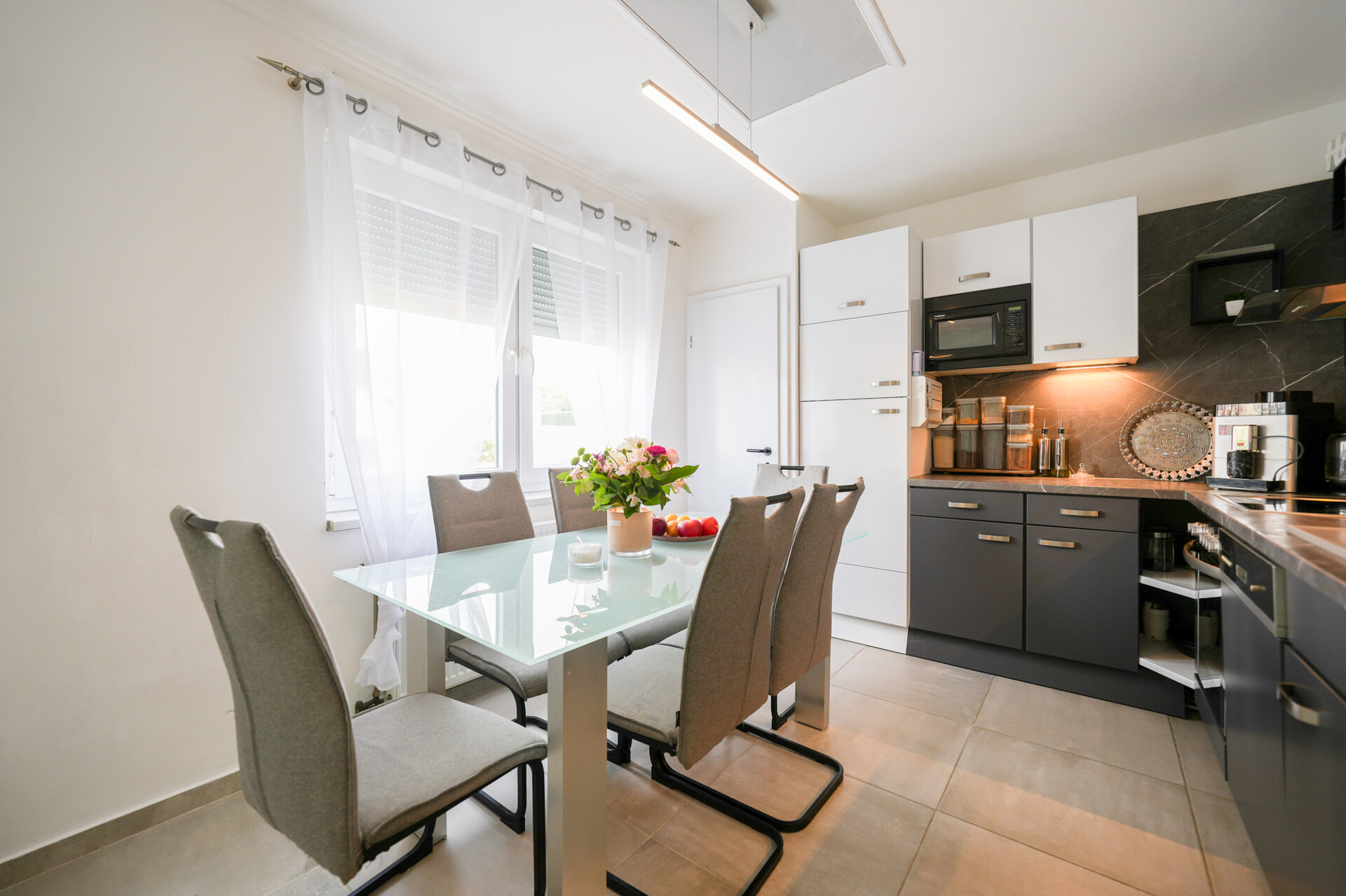 Der helle Wohn- und Essbereich bildet das Herzstück des Hauses und schafft eine angenehme Wohnatmosphäre. Auf dem ca. 245 m² großen Grundstück erwarten Sie ein gepflegter Garten, eine einladende Terrasse sowie eine Loggia mit direktem Zugang ins Grüne – perfekt für entspannte Stunden im Freien.