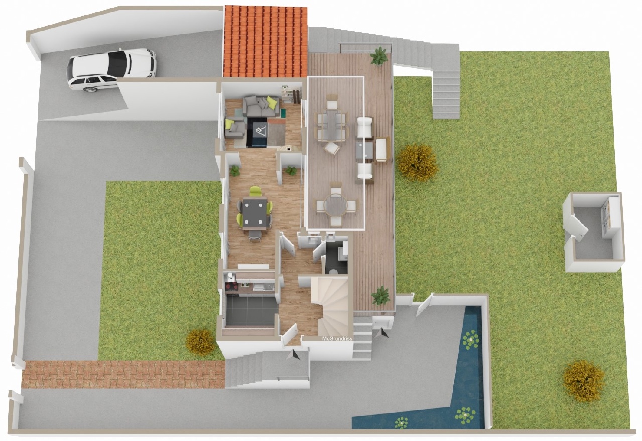 Außenanlagen: Vorgarten mit Rasenfläche Rückseitig gepflegter ebener Garten mit Gartenhaus, Teich mit Wasserlauf