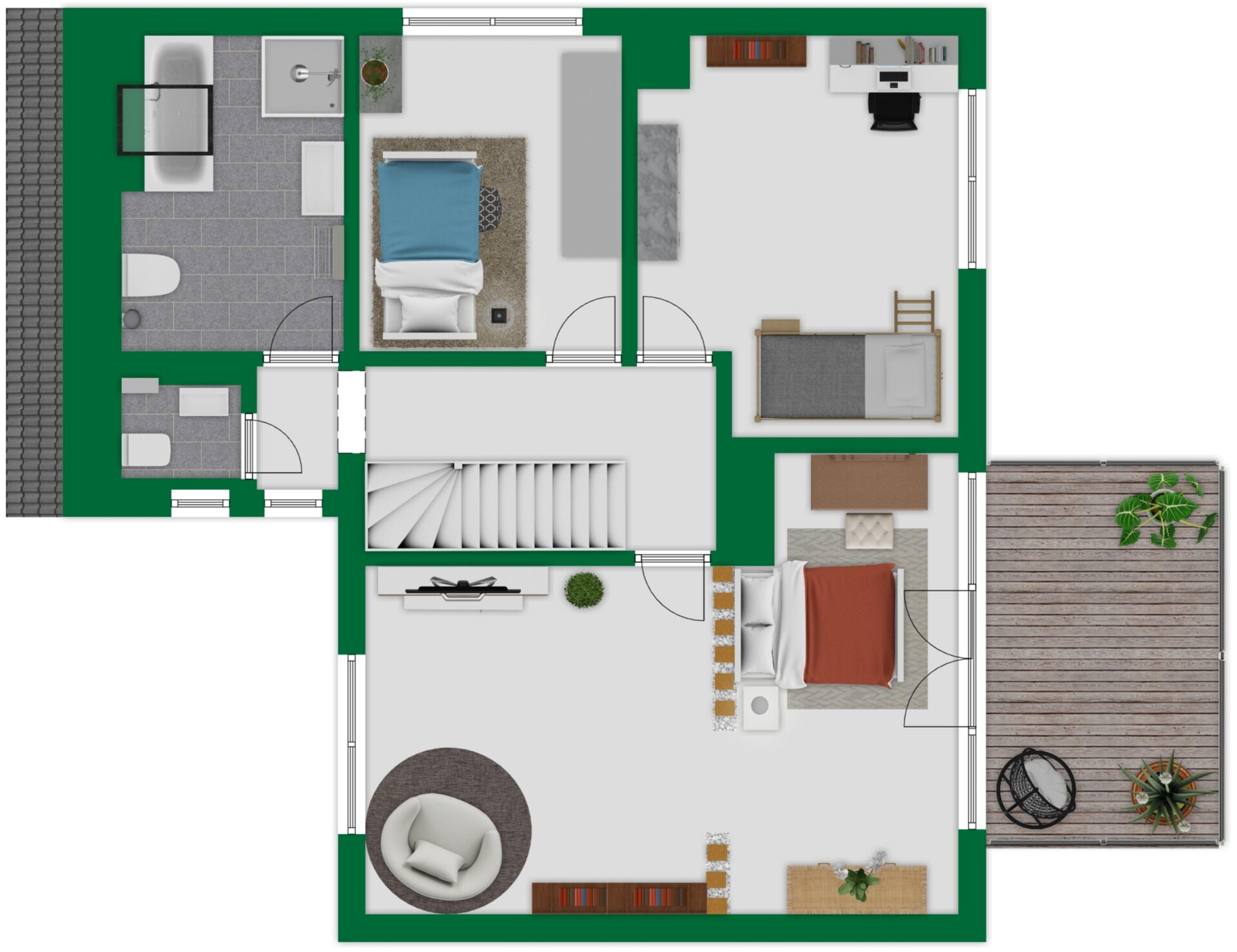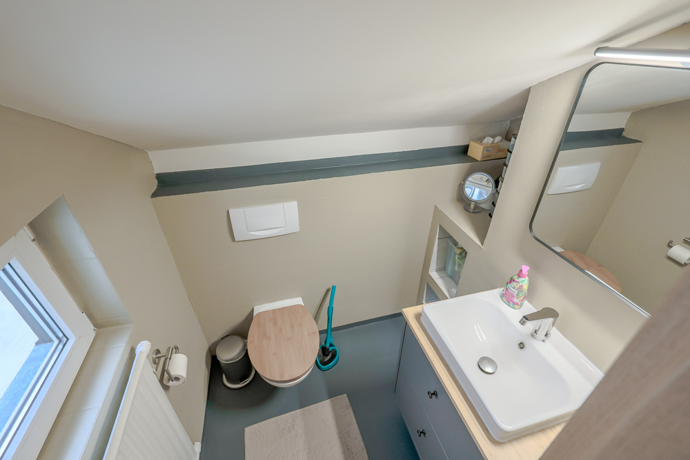 Das Obergeschoss bietet drei Schlafzimmer, von denen eines ursprünglich aus zwei Räumen bestand und bei Bedarf problemlos wieder geteilt werden kann, da der zweite Zugang vom Flur noch vorhanden ist. Ein Schlafzimmer verfügt über einen Balkon mit weitem Blick; bei guter Sicht ist sogar der Kölner Dom zu erkennen. Darüber hinaus befinden sich auf dieser Ebene ein Badezimmer mit Dusche und Badewanne sowie ein separates WC. Die Dachspitze ist gedämmt, die Dacheindeckung und Dämmung wurden im Jahr 2017 erneuert.