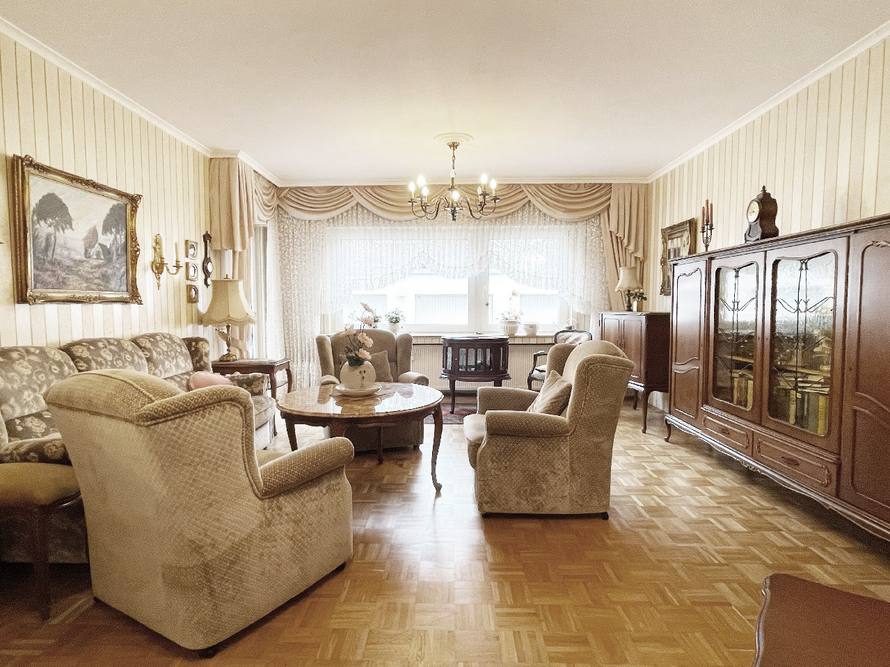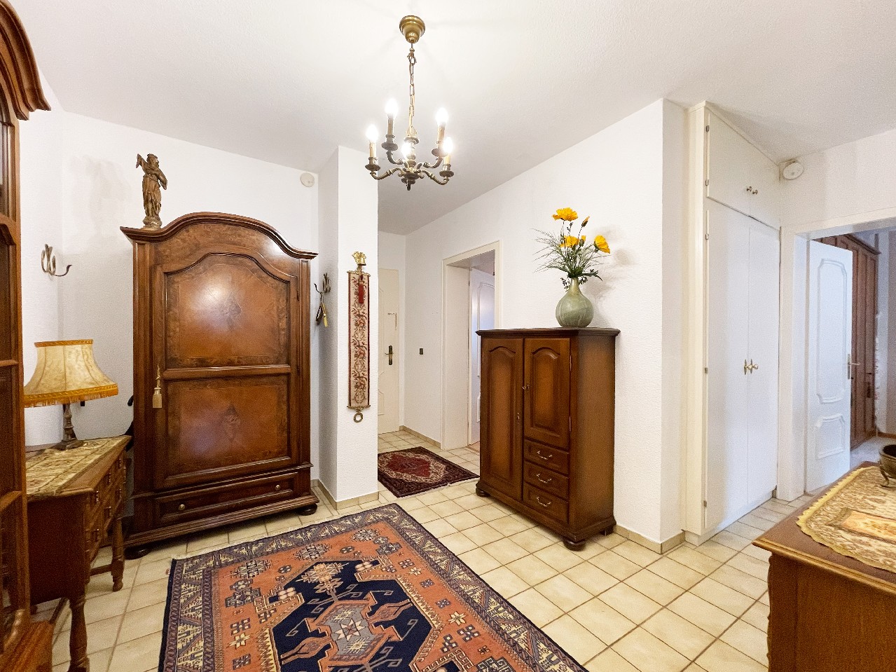 • Die Wohnung befindet sich in einem gepflegten und in Teilen modernisierungsbedürftigen Zustand (Verschönerungsmaßnahmen). Die Ausstattung zeigt sich im Einzelnen wie folgt: