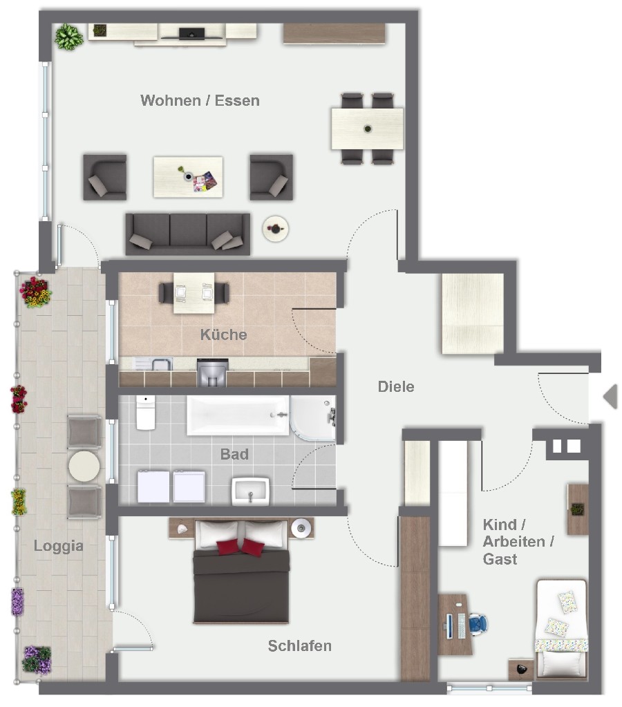 Bereits beim Betreten der Wohnung empfängt Sie eine großzügige Diele mit Abstellkammer. Das lichtdurchflutete Wohnzimmer bildet das Herzstück der Wohnung und begeistert durch seine Größe sowie den direkten Zugang zur überdachten Loggia. Ein besonderes Highlight: Das Tor sorgt für einen direkten, praktischen Zugang – ideal, um Einkäufe bequem und ohne Umwege in die Wohnung zu bringen. Auch eines der Schlafzimmer verfügt über einen direkten Loggiazugang und unterstreicht den hohen Wohnkomfort. Ein drittes Zimmer lässt sich flexibel als Kinder-, Gäste- oder Arbeitszimmer gestalten. Ergänzt wird das Raumangebot durch eine separate Küche mit Platz für eine kleine Sitzgelegenheit sowie ein helles Tageslichtbad mit Dusche und Badewanne. Hier befindet sich zudem ein praktischer Anschluss für die Waschmaschine.