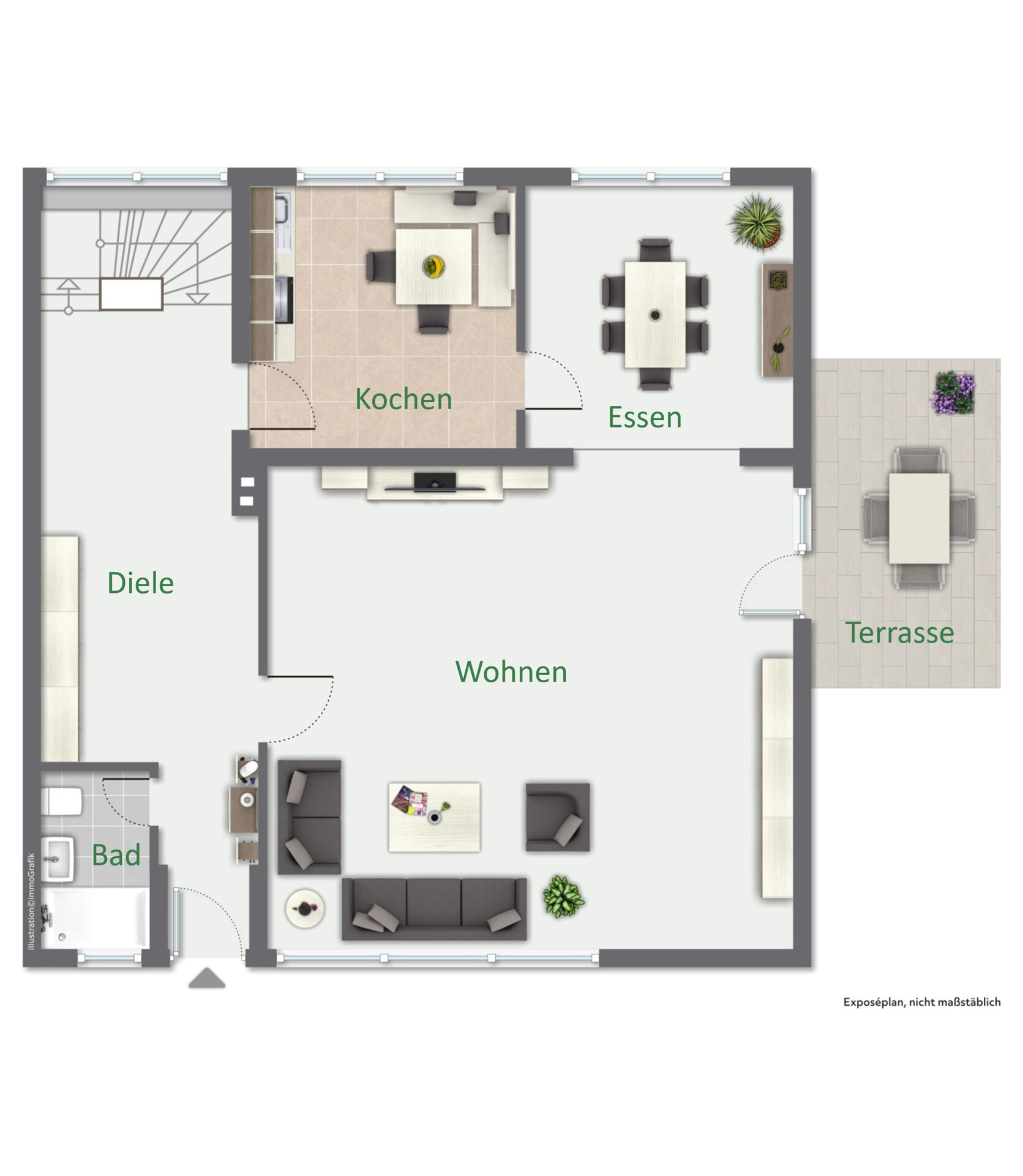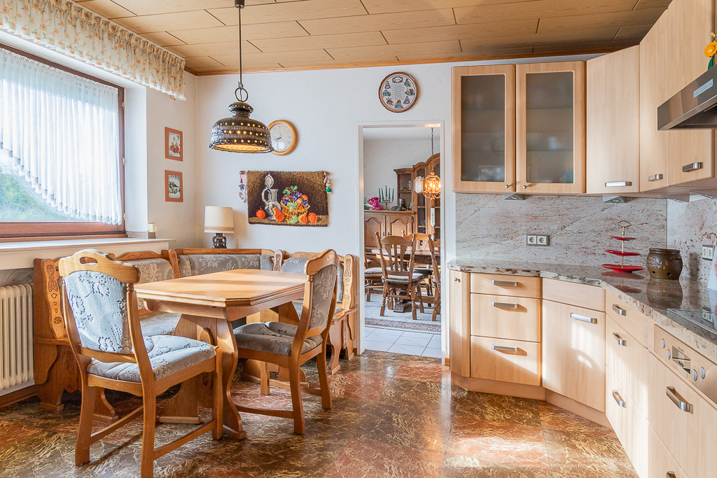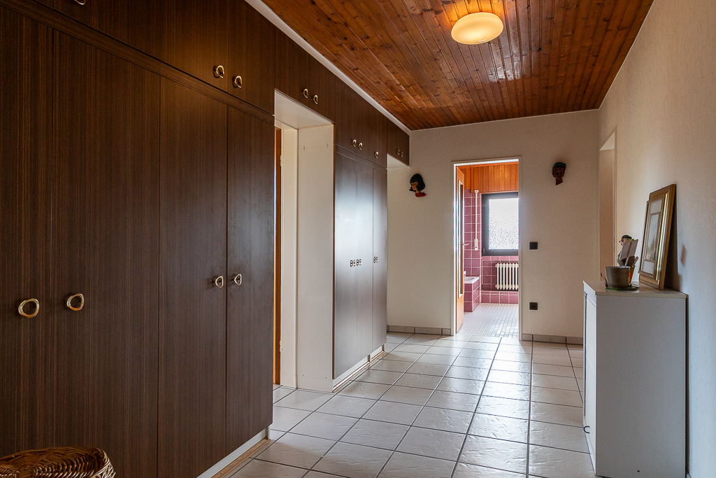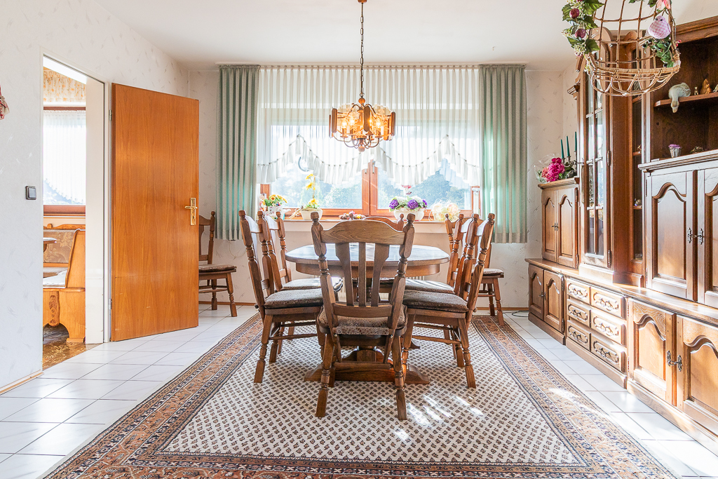 Dieses großzügige Einfamilienhaus bietet viel Freiraum und Entfaltungsmöglichkeiten für eine große Familie. Über drei Schieferstufen wird der geschützte Eingangsbereich des Hauses erreicht. Von hier aus betritt man die großzügige Eingangsdiele mit Garderobe und einem hellen, modernen und barrierefreien Duschbad. Das Herzstück des Hauses bildet das über 50m² große Wohnzimmer mit Panoramafenster und seitlichen Ausgang über eine Fenstertüre zu einer geschützten Terrasse. Der perfekte Ort für gemeinsame Stunden und entspannte Abende. Vom Wohnzimmer aus gelangt man über eine Stufe ins offene Esszimmer mit Verbindung zur Wohnküche, die auch von der Diele aus erreichbar ist.