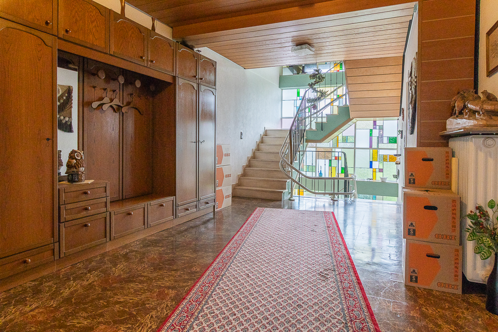 Auf der Südseite wird das Treppenhaus durch eine bis ins 1. Obergeschoss gehende Buntglasscheibe abgeschlossen, welche die Diele in verträumtes Licht taucht. Eine halb gewendelte massive Treppe mit italienischem Marmor, erschließt alle Etagen des Hauses.