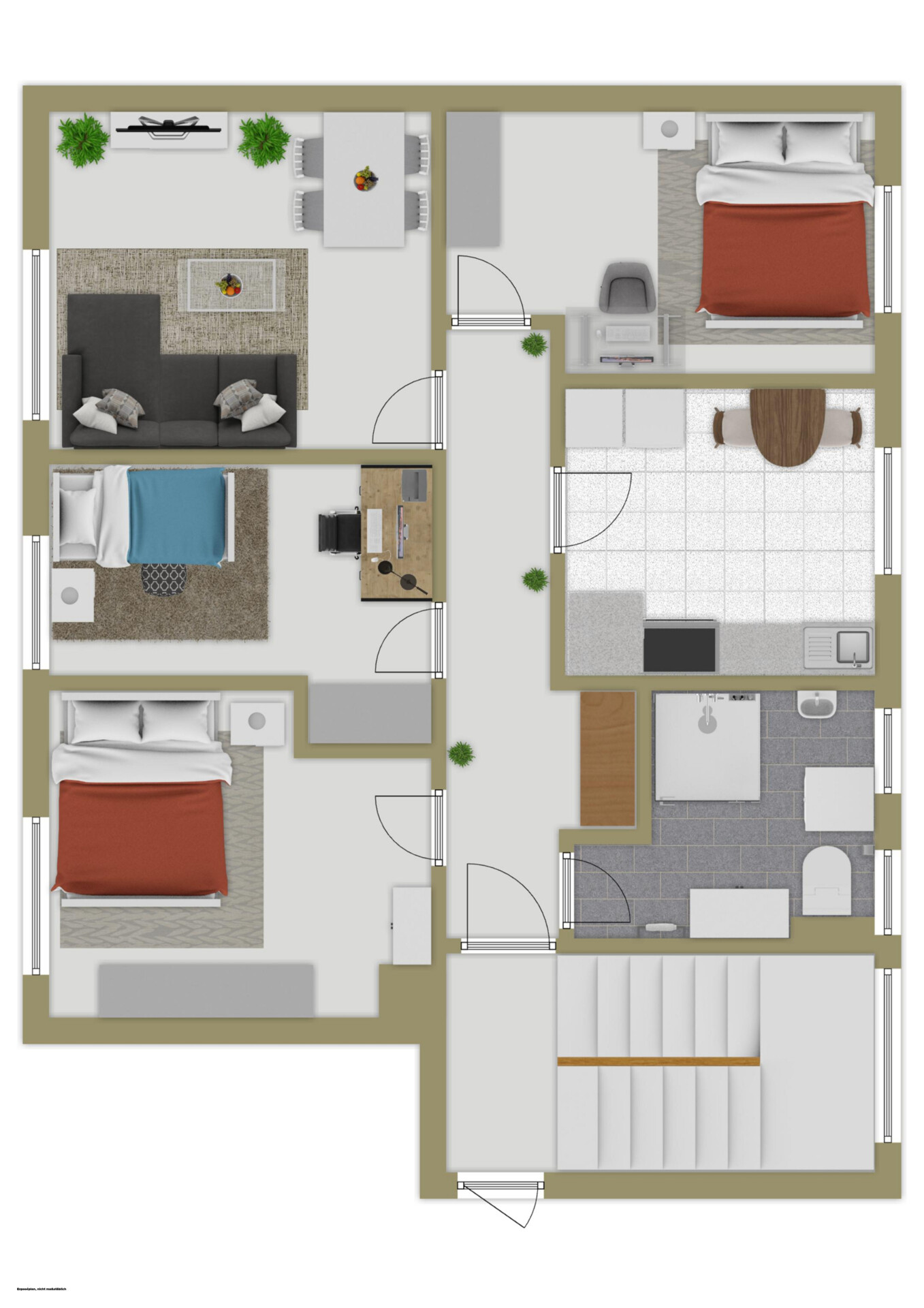 Drei flexibel nutzbare Zimmer eröffnen Ihnen unzählige Gestaltungsmöglichkeiten: Ob als gemütliche Schlafzimmer, stilvolles Homeoffice oder Kinderzimmer – hier können Sie Ihre ganz persönlichen Ideen verwirklichen. Die separate Küche lädt zu kreativen Kochabenteuern ein und sorgt für eine klare Trennung von Kochen und Wohnen, ohne den Kontakt zu Familie oder Gästen zu verlieren.
