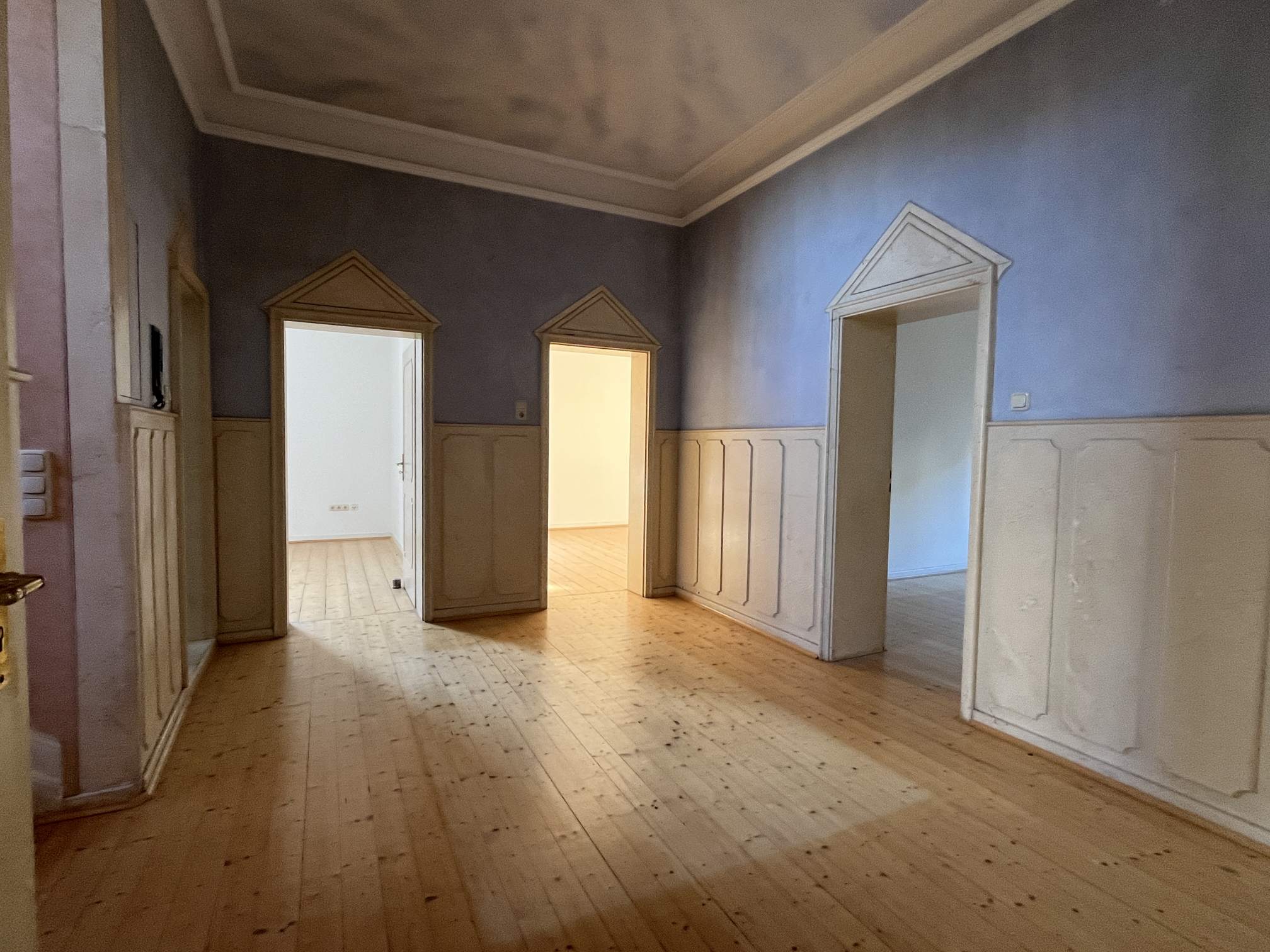 Ein Haus mit viel Geschichte und Stil: ca. 377 m² Wohnfläche verteilt auf drei Etagen. Verschiedenste Nutzungsmöglichkeiten sind denkbar: Ein Büro im EG und darüber eine großzügige Wohneinheit oder als Mehrgenerationenhaus für bis zu drei Familien. Durch die Lage des Treppenhauses ist die absolute Teilung der Einheiten eher schwierig, eine Fremdvermietung bietet sich daher nicht an.