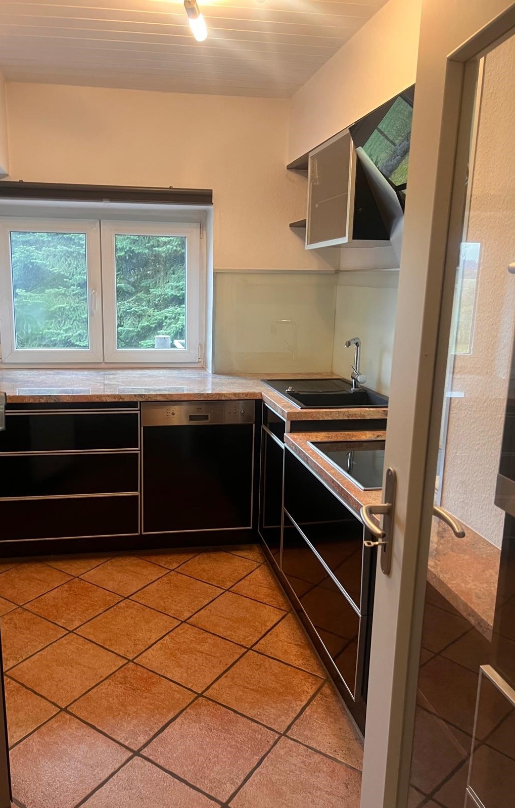 • Die Küche ist zur Zeit ausgestattet u.a.mit Herd, Spülmaschine und einem Ofen in Arbeitshöhe.