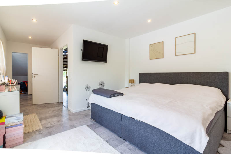 Über eine elegante Holztreppe gelangen Sie ins Obergeschoss, wo mehrere Räume flexibel als Schlafzimmer, Homeoffice oder Rückzugsort nutzbar sind. Das modernisierte Badezimmer besticht mit hochwertigem Design und stilvolle Armaturen. Zusätzliches Ausbaupotenzial bietet das bereits gedämmte Dachgeschoss – ideal als Gästezimmer, Atelier oder kreativer Spielbereich für die Kinder, lassen Sie Ihren Ideen freien Lauf!