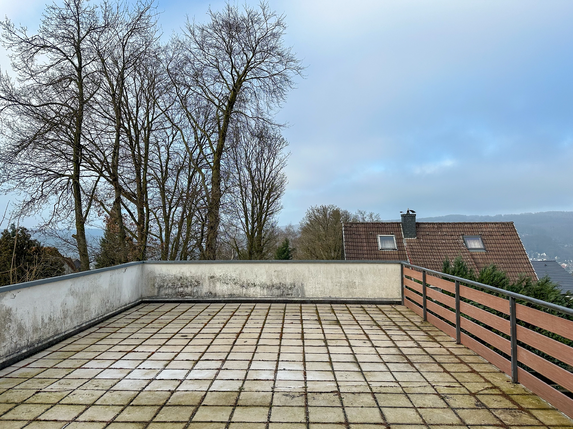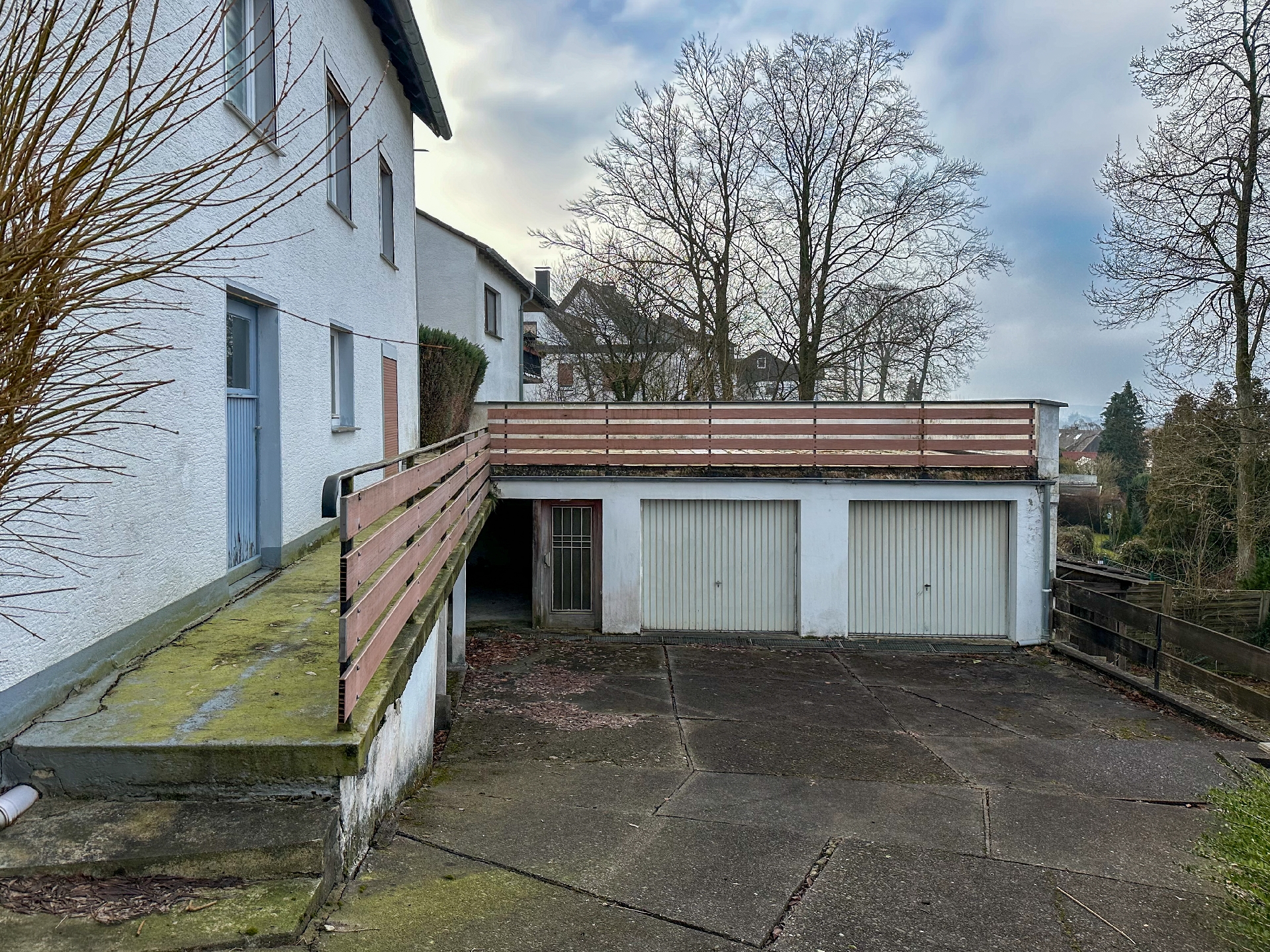 Mit traumhafter Dachterrasse und drei Garagen: Freistehendes Ein- bis Zweifamilienhaus auf Homberge