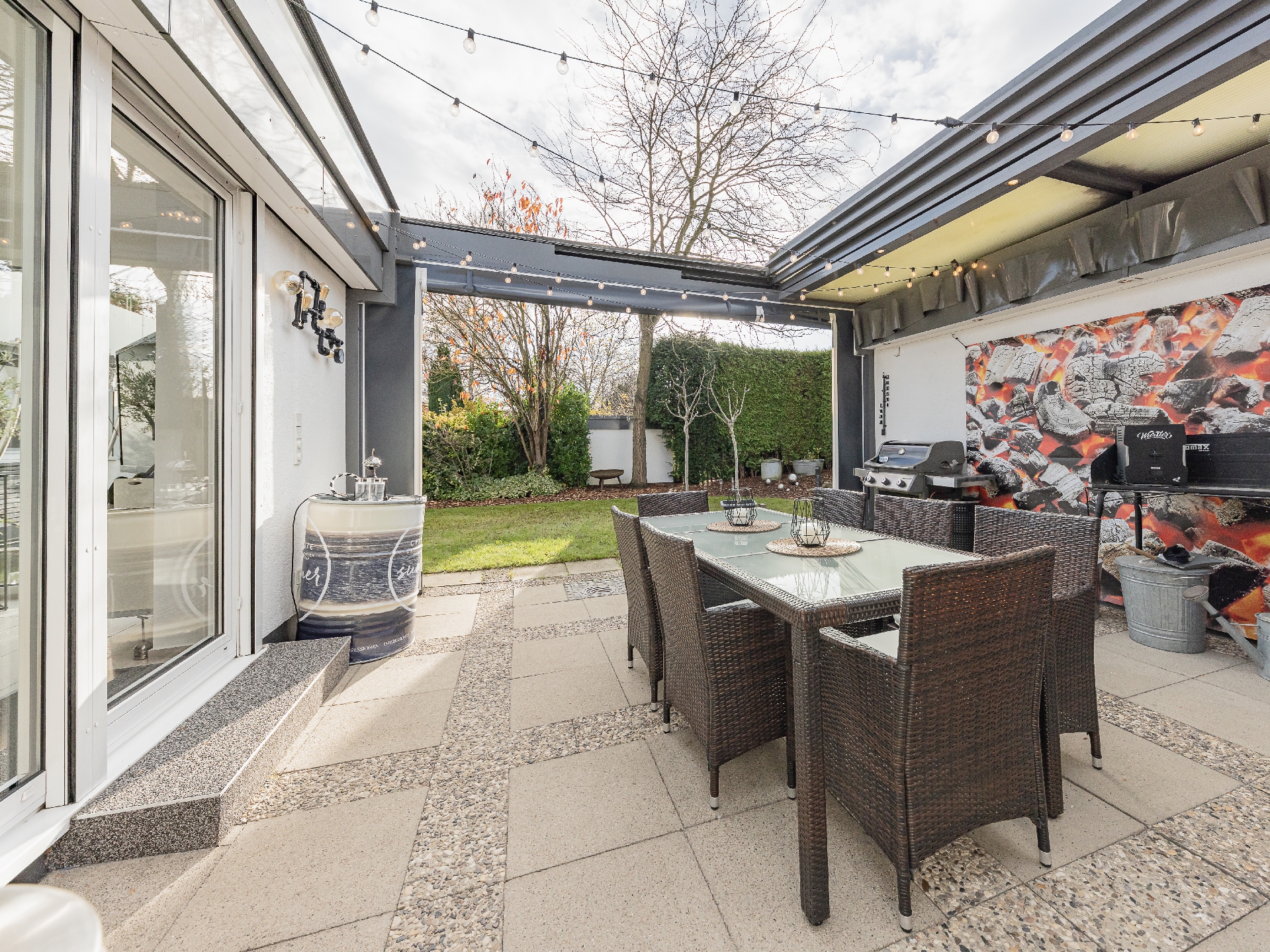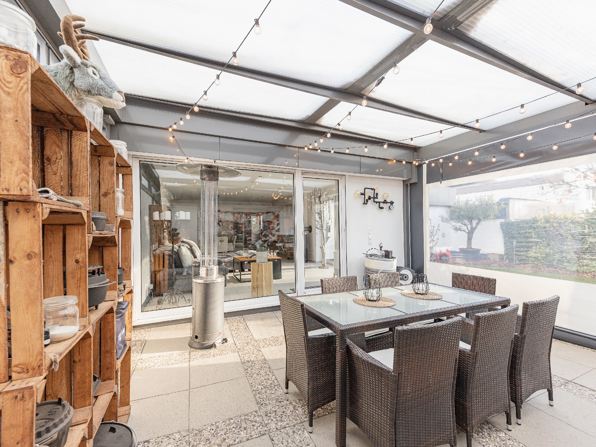 Außenterrasse mit verschließbarem Dach und verschließbarer Seitenwand