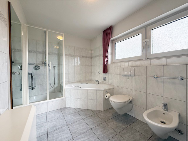 •Badezimmer mit Dusche und Eckbadewanne, Waschbecken, WC und Bidet mit Tageslichtfenster zur Gartenseite