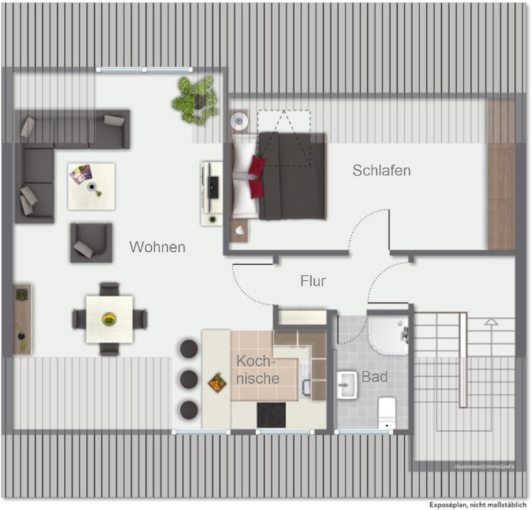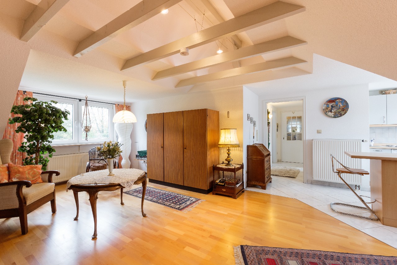 Dachgeschoss: (ca. 54 m²) Das Dachgeschoss wurde 1997 wohnlich ausgebaut und zeigt sich hell und modern. Der ca. 32 m² große Wohn- /Essbereich mit Kochnische bietet mit seinen Schrägen eine tolle Atmosphäre. Ein Schlafraum sowie ein Duschbad runden das Flächenangebot auf dieser Ebene ab.