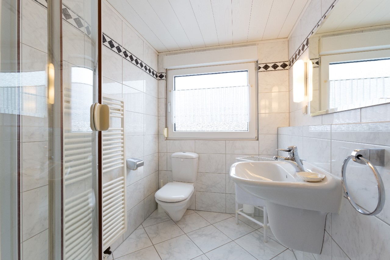 Dachgeschoss: Duschbad mit Waschbecken, WC und Fenster