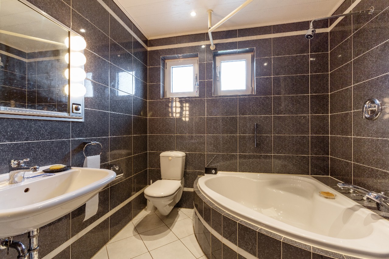 Erdgeschoss: Bad mit Wanne, Dusche, Waschbecken, Bidet, WC und Fenster