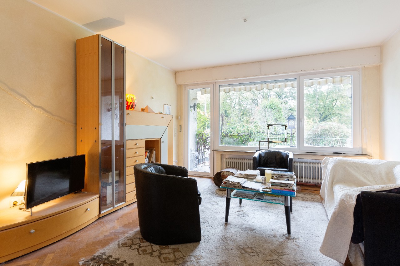 Erdgeschoss: (ca. 85 m² mit Terrasse) Der ca. 41 m² große Wohn-/Essbereich bildet den großzügigen Mittelpunkt der Wohnung und zeigt sich hell und freundlich. Der Wohnbereich verfügt über einen direkten Zugang zur Terrasse (mit Markise) und in den Garten. Der Wohnraum erstreckt sich über die gesamte Haustiefe und verfügt zudem über einen gemauerten offenen Kamin. Zudem stehen Ihnen auf diese Ebene ein zur Gartenseite liegendes Schlafzimmer, eine Küche (ebenfalls mit Ausgangsmöglichkeit in den Garten), eine Diele sowie ein Dusch- und Wannenbad zur Verfügung.