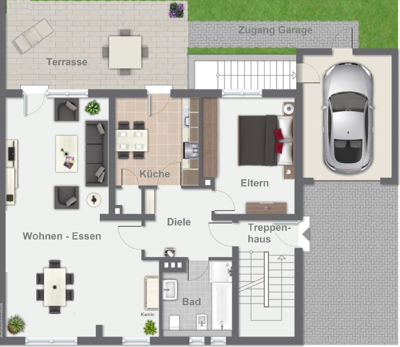 Der Zugang erfolgt seitlich am Haus. Ein geschlossenes Treppenhaus bietet die Möglichkeit der eigenen Nutzung als Mehrgenerationenhaus oder auch einer Teilvermietung.