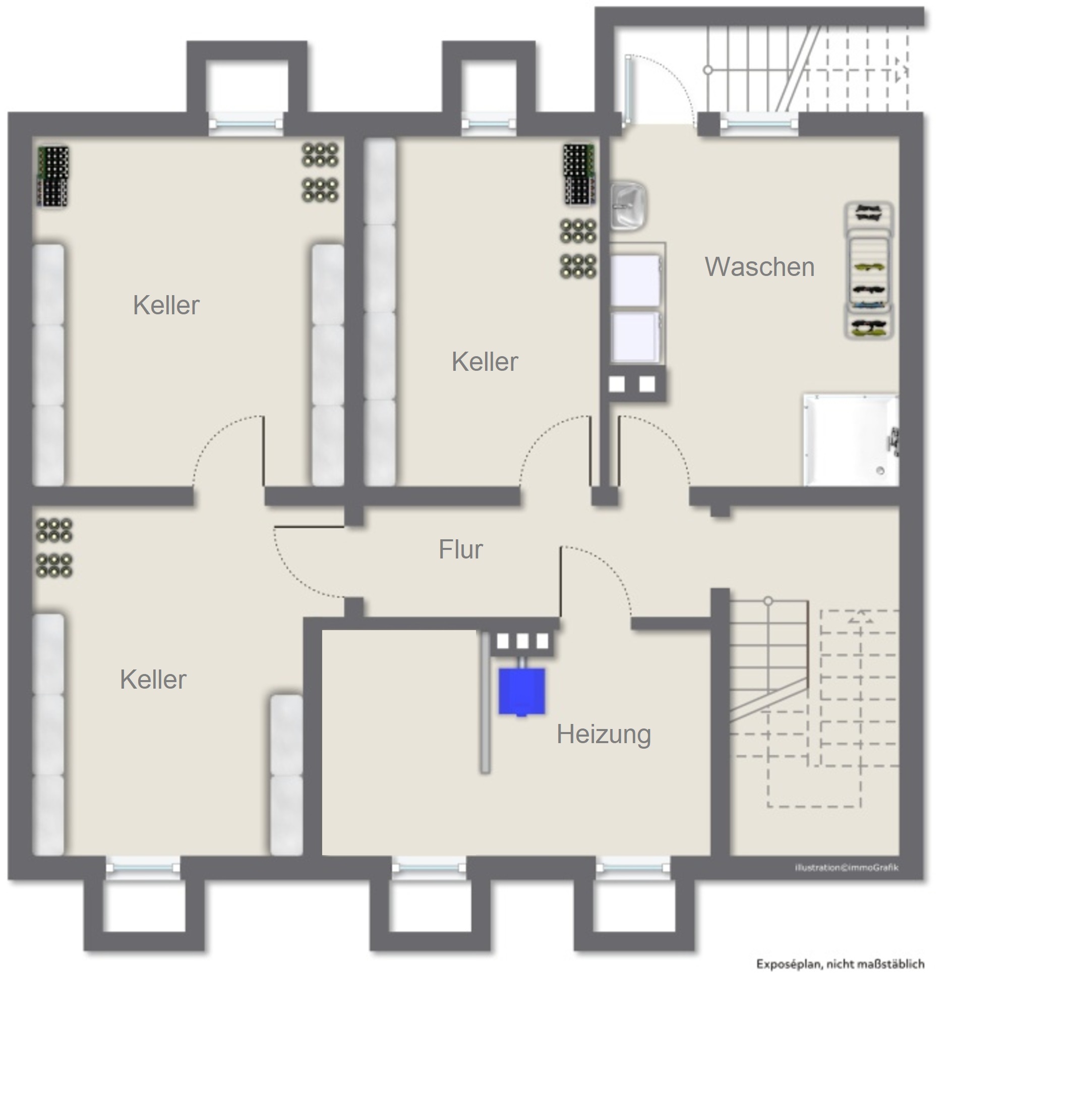 Die Immobilie ist vollständig unterkellert und bietet drei klassische Kellerräume, einen Heizungskeller sowie eine Waschküche mit Ausgang in den Garten.