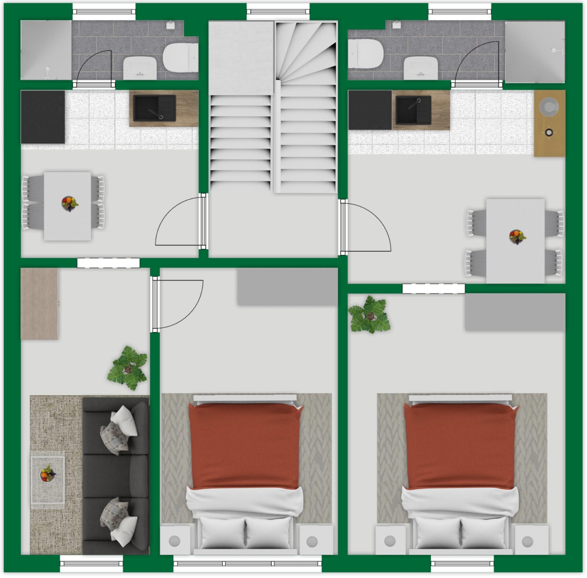 Ein besonderer Vorteil: Einheit 1 und 2 lassen sich sehr gut zu einer großen Erdgeschosswohnung zusammenführen, wodurch zusätzlicher Wohnwert geschaffen werden kann.Obergeschoss