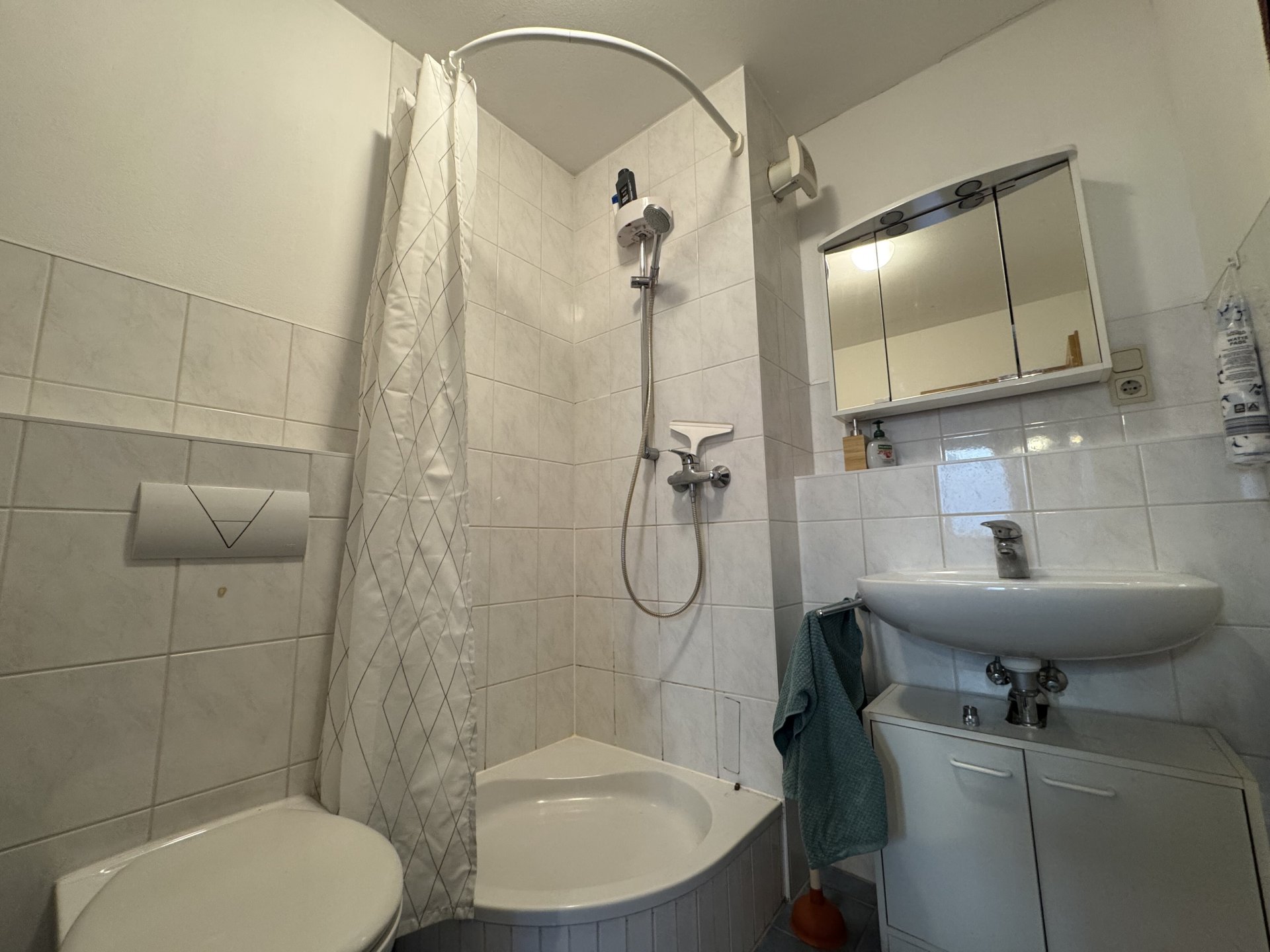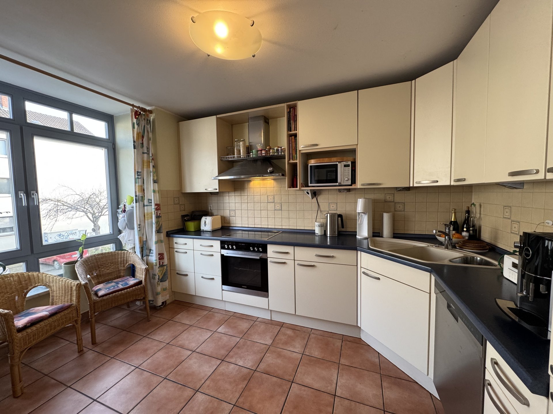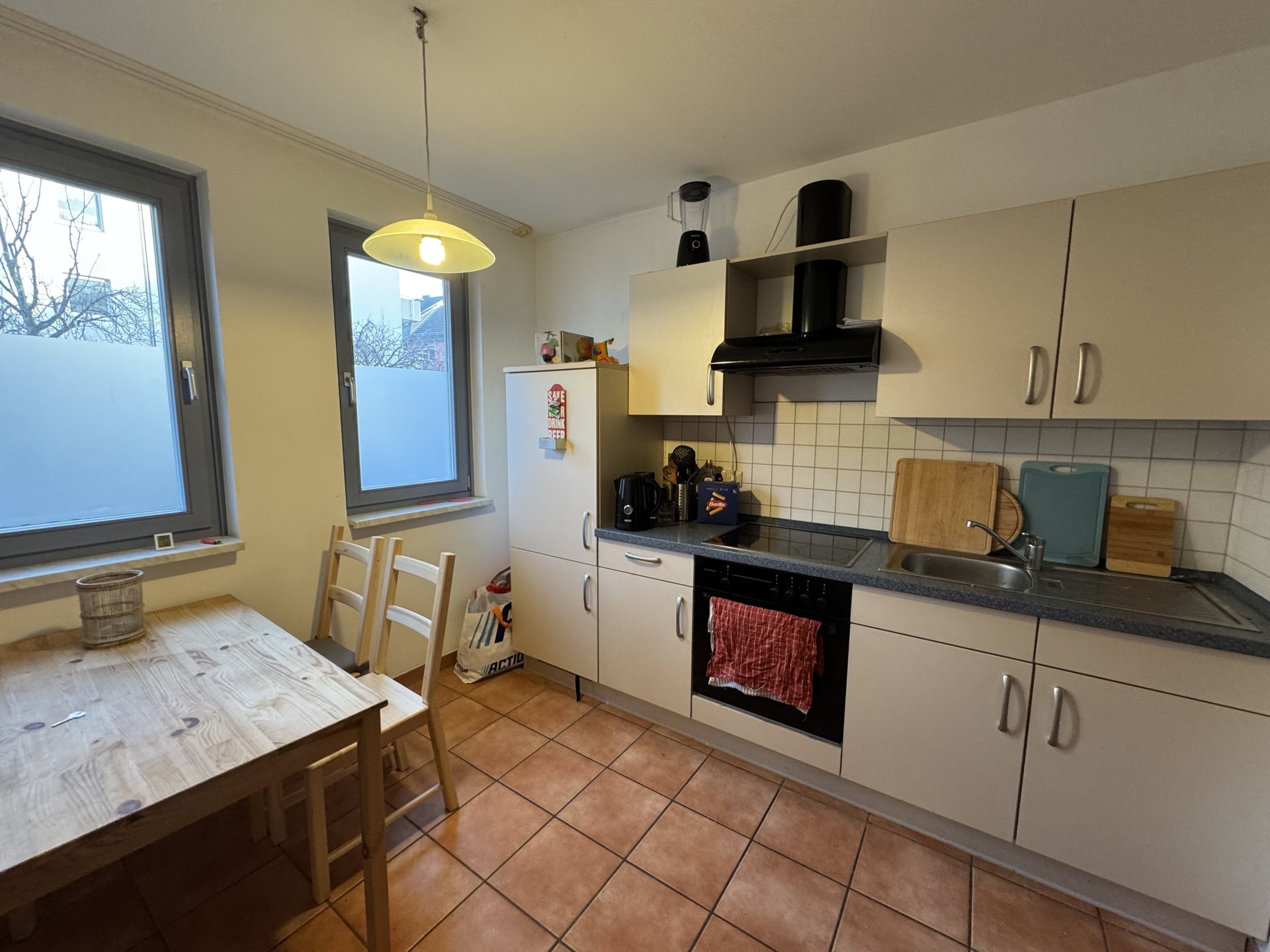 Auf der darüber liegenden Ebene befindet sich eine schöne Wohnküche (Einbauküche kann ggf. mit übernommen werden) mit einem gemütlichen Erker, einem kleinen Flur mit Abstellraum/Garderobe und einer Toilette.