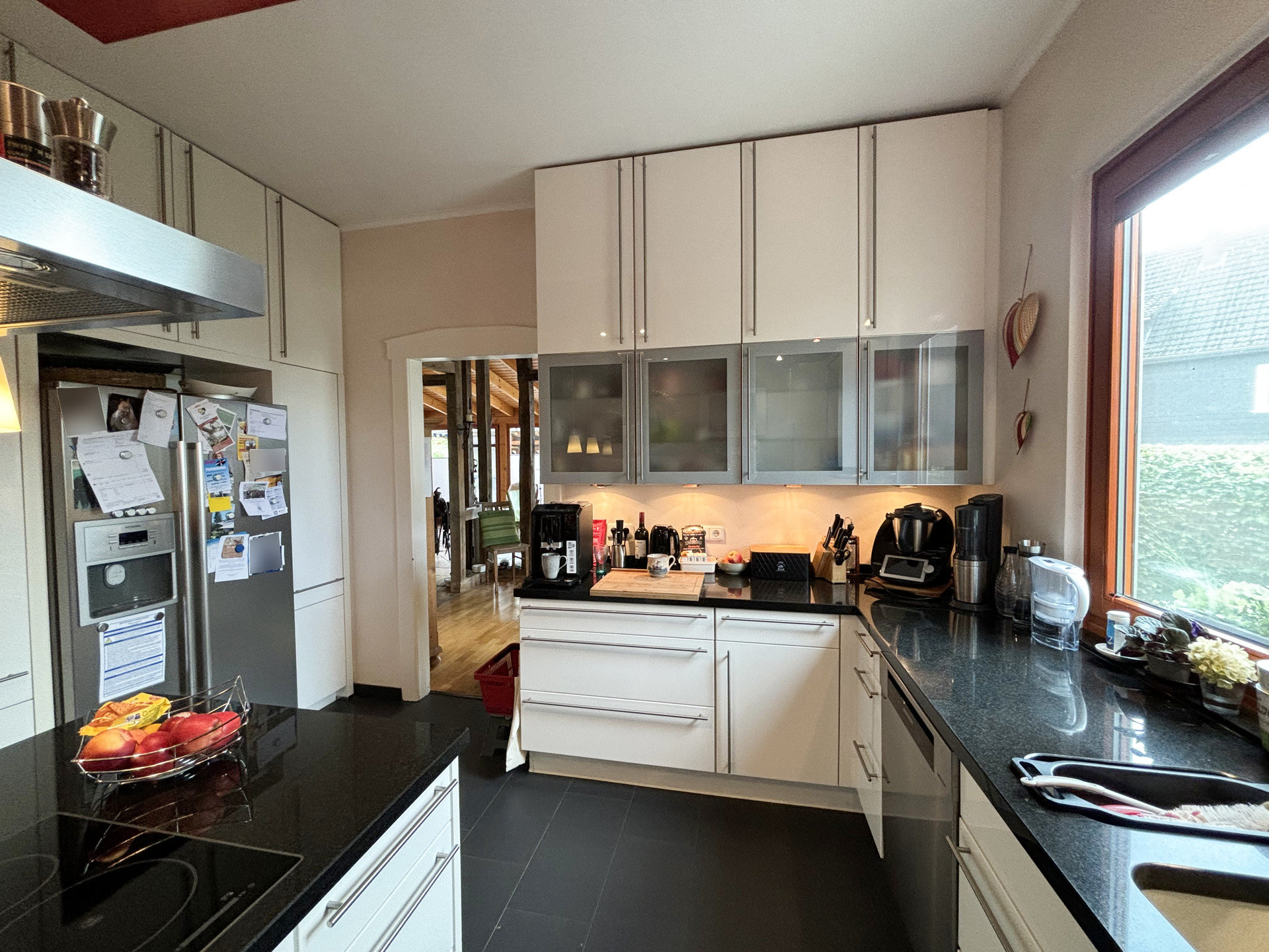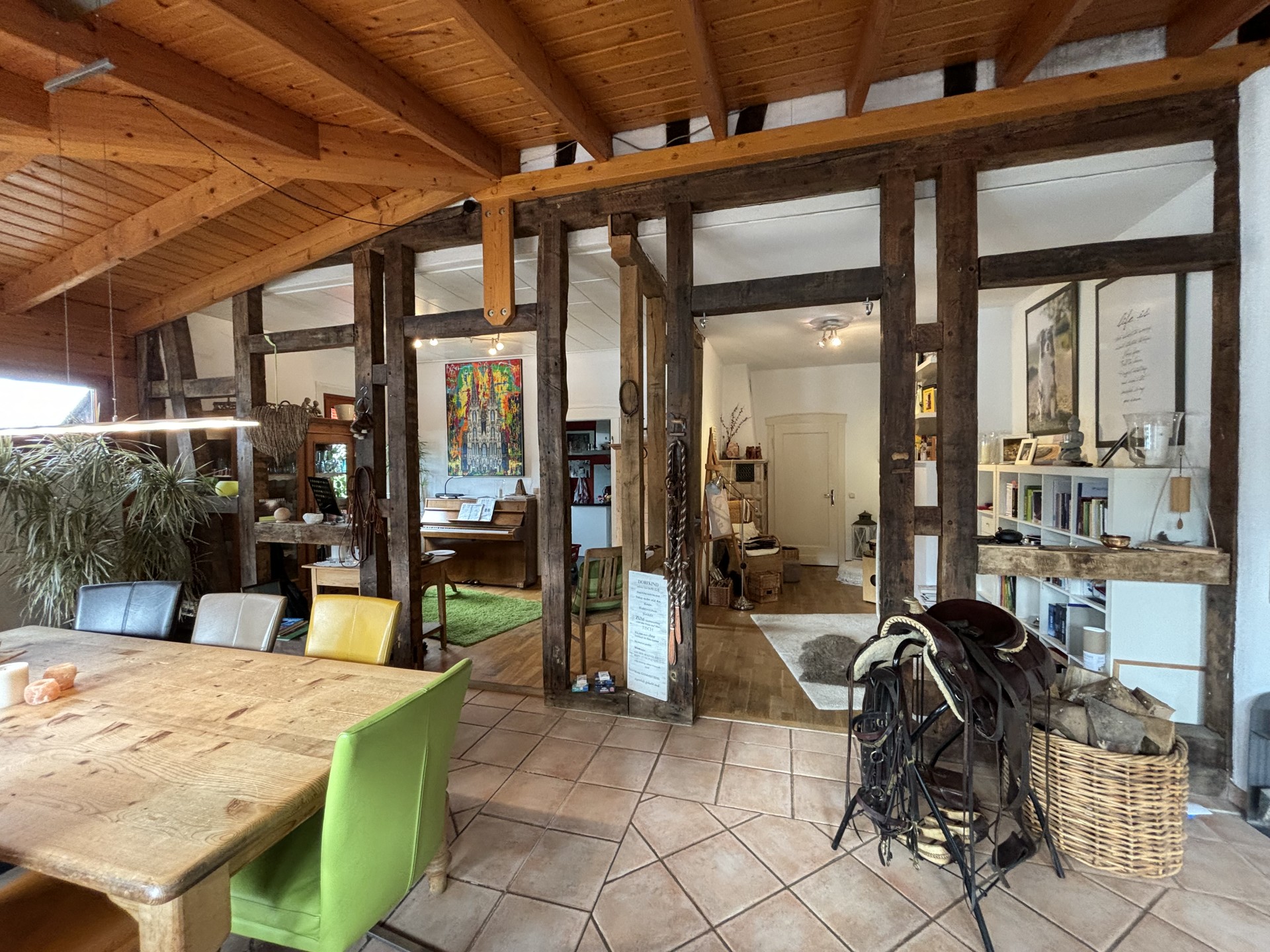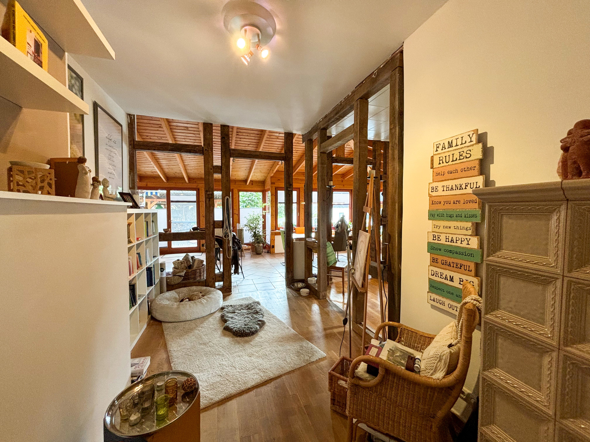 Dieses zauberhafte Fachwerkhaus bietet den perfekten Rückzugsort für alle, die eine Immobilie in einem überwiegend exzellenten Zustand und mit viel Liebe zum Detail suchen. Das Erdgeschoss des Hauses besticht durch seine großzügigen und lichtdurchfluteten Räume. Im Anbau befindet sich ein gemütlicher Wintergarten, der dank der bodentiefen Fenster den Blick in den traumhaften Garten freigibt. Hier sorgt eine Fußbodenheizung auch an kalten Tagen für wohlige Wärme. Das luxuriöse Badezimmer im Erdgeschoss lässt keine Wünsche offen: Eine bodentiefe Regendusche, eine Badewanne und hochwertige Materialien bieten Wellness-Feeling pur. Der offene Wohnbereich wird durch einen stilvollen Kamin komplettiert, der in den Wintermonaten für behagliche Stunden sorgt. Die moderne Küche ist das Herzstück des Hauses. Ausgestattet mit einer großzügigen Kochinsel und einer Theke, lädt sie zu geselligen Kochabenden und kulinarischen Highlights ein. Das Obergeschoss befindet sich in einem gepflegten Zustand, bedarf jedoch einer Renovierung, um das Potenzial des Hauses voll auszuschöpfen. Der geräumige Dachboden bietet weiteres Ausbaupotenzial, um zusätzlichen Wohnraum zu schaffen – ideal für ein weiteres Schlafzimmer, ein Arbeitszimmer oder einen Hobbyraum.