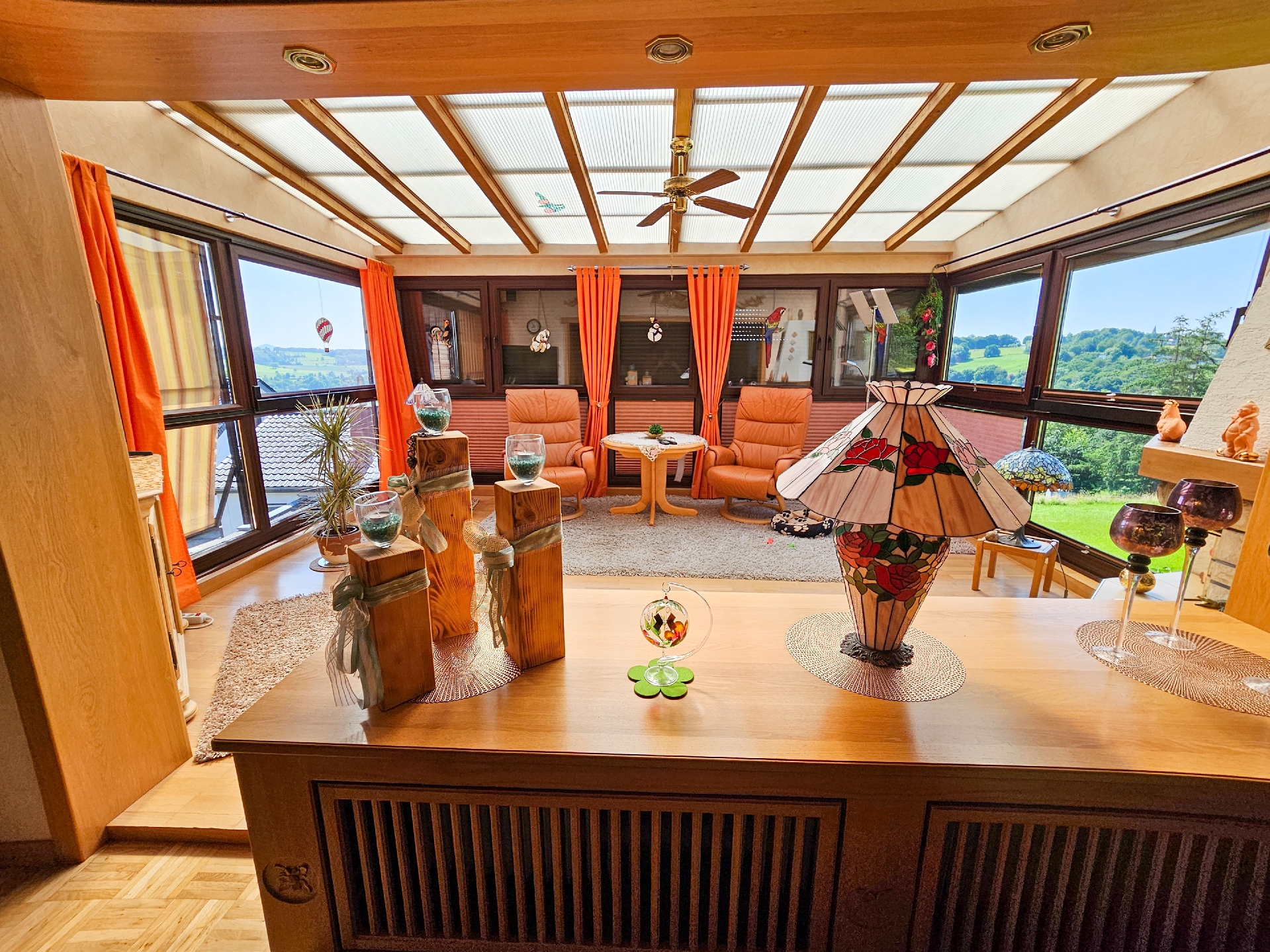 Großzügiges Wohnzimmer mit angebautem Wintergarten (von 2006), der viel Licht und eine angenehme Atmosphäre bietet inklusive Kaminofen für gemütliche Stunden