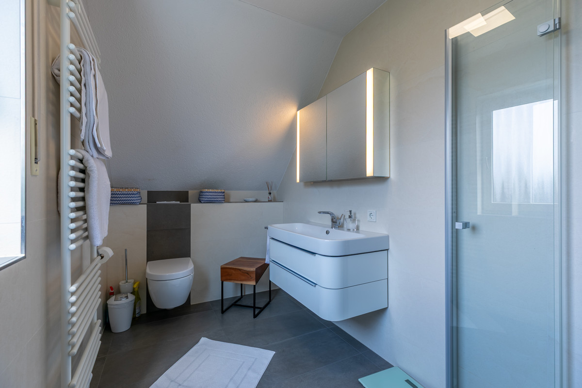 Im Dachgeschoss erwarten Sie gleich drei gemütliche Schlafzimmer für erholsame Stunden. Die lieben Kleinen haben Sie deshalb immer im Blick. Ein im Jahre 2020 geschmackvoll modernisiertes Duschbad mit Walk-in Dusche verspricht einen guten Start in den Tag. Hier können Sie in eine Welt der Entspannung eintauchen und den Stress des Alltags hinter sich lassen.