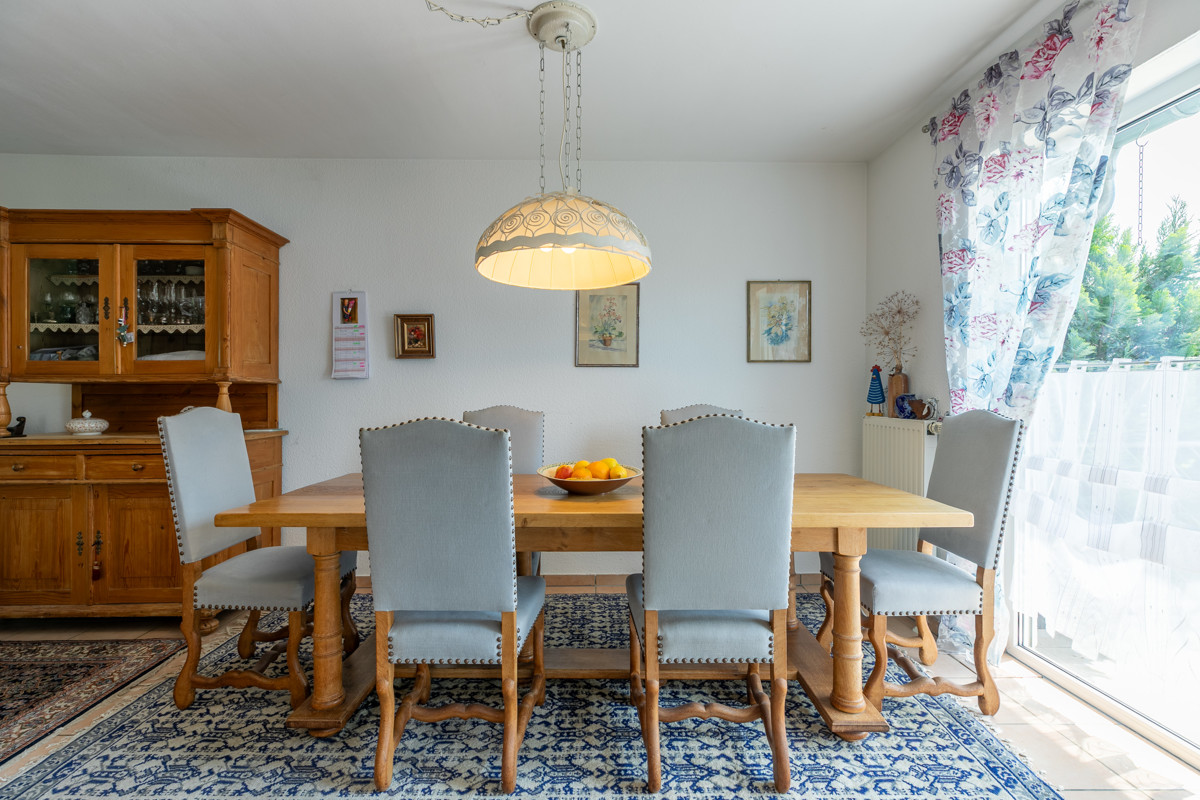 Viel Tageslicht und offene Räumlichkeiten heißen die Bewohner gleich beim Betreten willkommen. Ein sehr großzügiges Wohn-Esszimmer (ca. 44 m²) mit dekorativem Kaminofen werden Sie sofort begeistern. Die direkt angrenzende Küche ist voll ausgestattet mit einer ansprechenden Einbauküche, die bereits im Kaufpreis enthalten ist. Das Gäste-WC überzeugt durch einen frischen Look und verspricht Wohlfühlgarantie.
