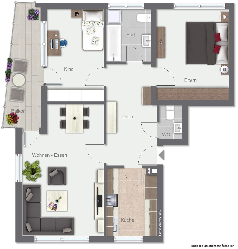 Die Wohnung mit ca. 82 m² verfügt über einen guten Grundriss. Ein ca. 24 m² großer Wohn- /Essbereich und Zugang zum Balkon. Zwei mögliche Schlafzimmer mit Größen von ca. 12 m² und ca. 14 m² Wohnfläche, ein Gäste-WC sowie ein Dusch- und Wannenbad mit Fenster runden das Wohnflächenangebot ab. Zur Wohnung gehören eine Garage sowie ein Kellerraum. Ein Fahrradkeller steht zur gemeinschaftlichen Nutzung zur Verfügung.