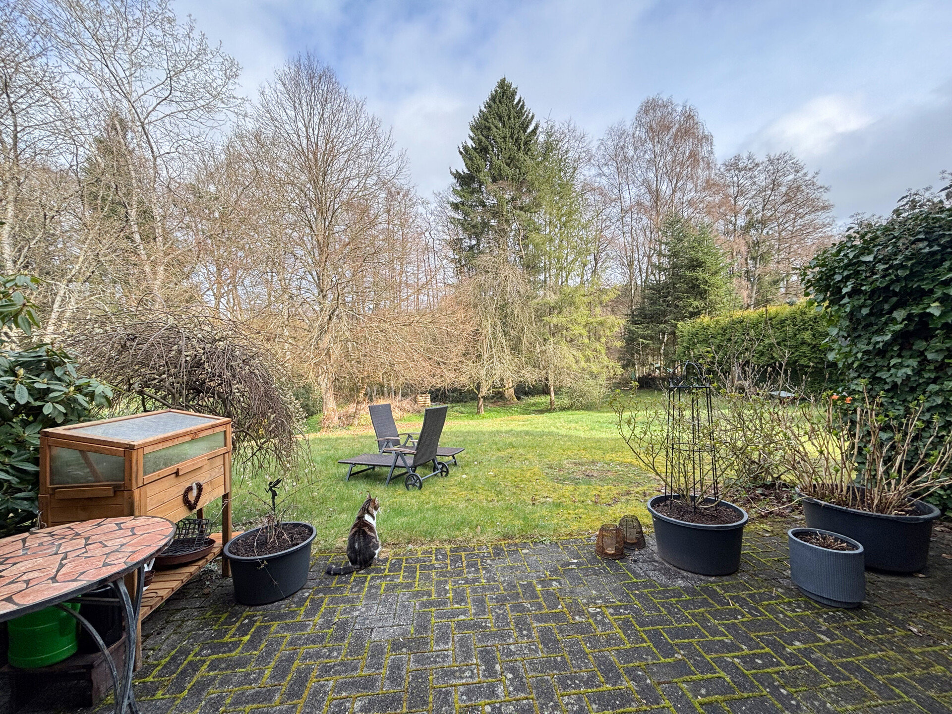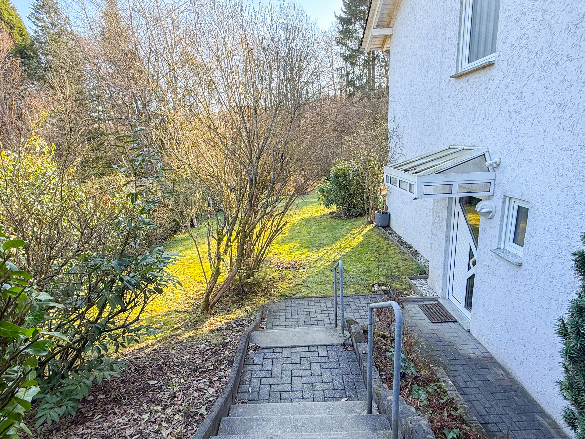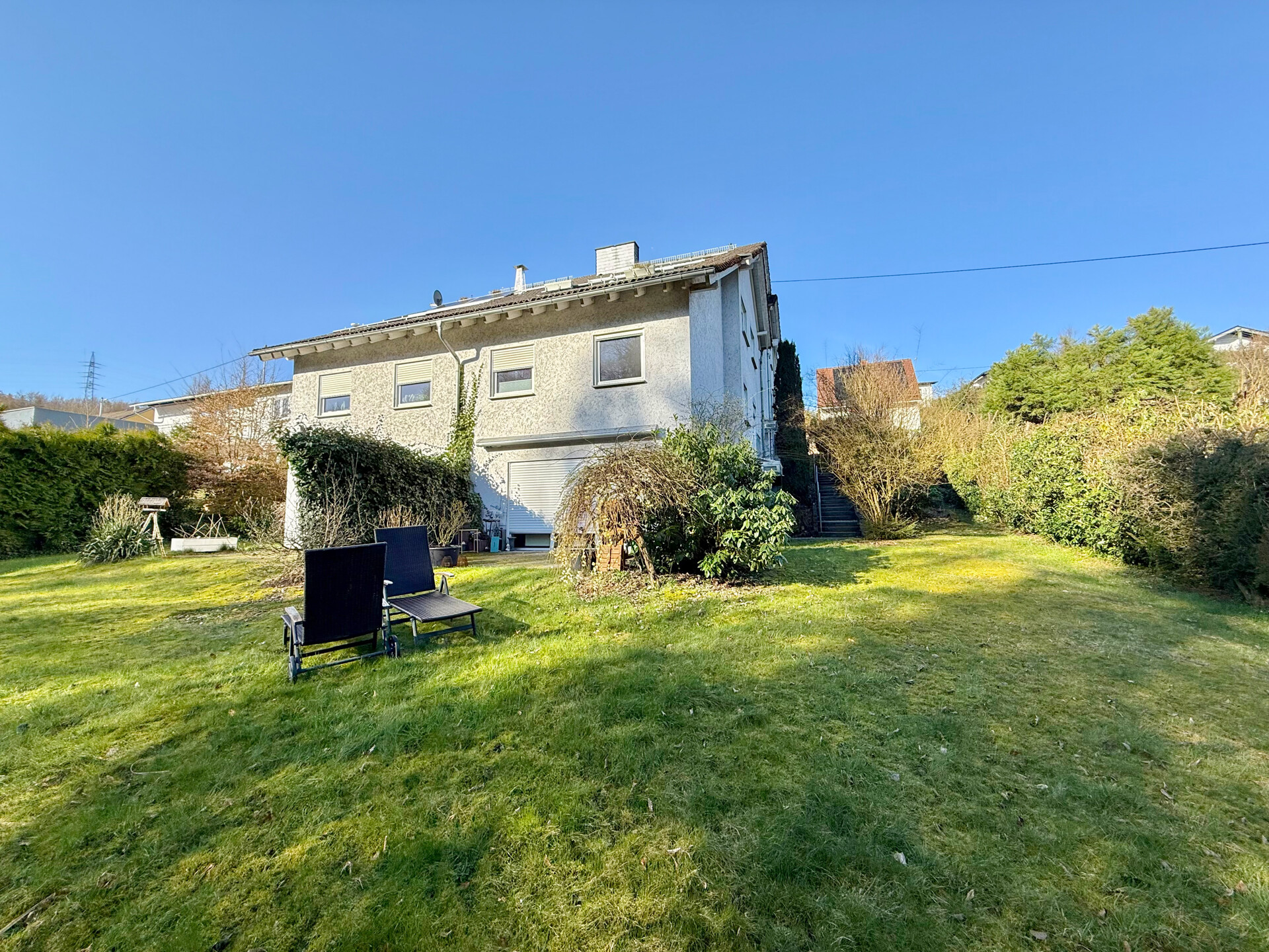 • Diese gepflegte 4 Zimmer-Maisonette-Eigentumswohnung (Nr. 1) befindet sich im Untergeschoss eines im Jahr 1994 errichteten Mehrfamilienhauses mit insgesamt sechs Wohneinheiten. Durch die Hanglage bietet die Wohnung einen direkten Zugang vom Wohnzimmer auf die Terrasse und in den Gartenbereich. Die Wohnfläche von ca. 110 m² erstreckt sich über zwei Ebenen und sorgt für eine angenehme Aufteilung der Räume. Auf der unteren Etage befinden sich eine Küche mit Einbauküche, ein Gäste-WC, ein großzügiger Abstell-/HWR sowie ein helles, geräumiges Wohnzimmer mit Zugang zur Terrasse. Von hier aus gelangt man in den gemeinschaftlichen Gartenbereich, der im hinteren Teil an einen kleinen Bachlauf und eine bewaldete Fläche grenzt und somit eine besonders naturnahe Atmosphäre bietet. Über eine Treppe erreicht man die obere Ebene. Hier stehen zwei Schlafzimmer, ein Büro sowie ein modernisiertes Bad zur Verfügung. Ein eigener Stellplatz im oberen Grundstücksbereich gehört ebenfalls zur Wohnung. Die Einheit ist aktuell vermietet und erzielt eine monatliche Kaltmiete von 950 €. Es besteht ein Vertrag mit einer Hausverwaltung, die sich um die Abrechnungen der WEG kümmert. Zwei Räume werden zeitnah noch renoviert (Tapezieren + Streichen).