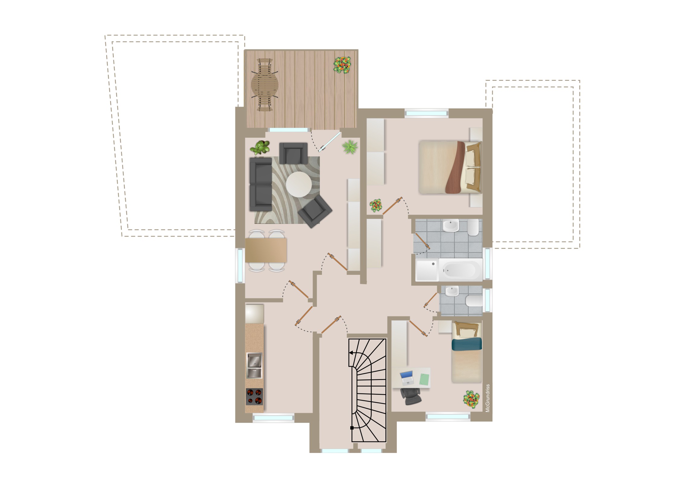 Die Obergeschosswohnung ist ebenfalls mit 3 Zimmern ausgestattet und verfügt über eine Wohnfläche von 75 m². Ein großer Balkon bietet den Mietern einen bezaubernden Blick in die Umgebung und lädt zu gemütlichen Stunden im Freien ein.