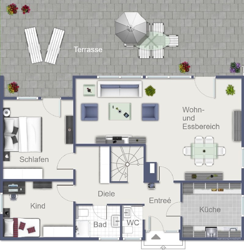 Der nicht einsehbare Garten ist mit Hecken und Sträuchern sehr schön angelegt worden und kann mit ein bisschen Freude an der Gartenarbeit zum Strahlen erweckt werden. Die Terrasse ist durchgehend gefliest und bietet einen hervorragenden Blick in den Traumgarten