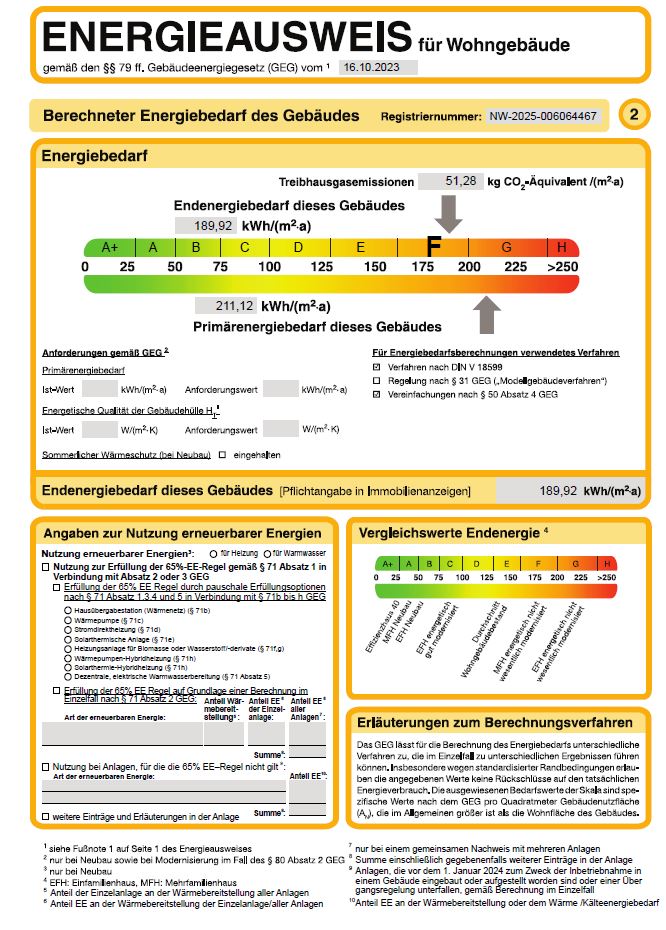 - Endenergiebedarf: 189,92 kWh/(m²*a)