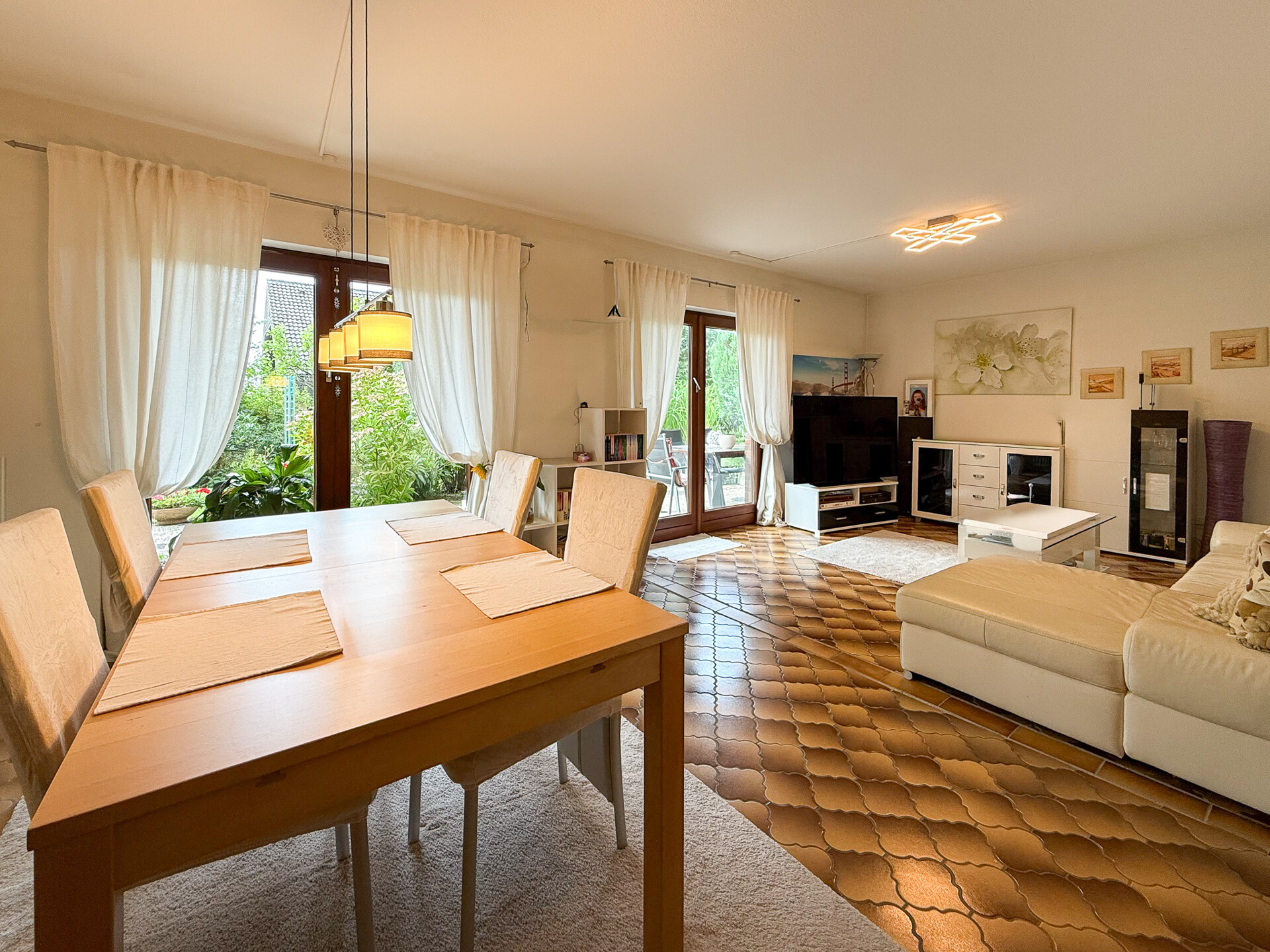 Beim Betreten des Erdgeschosses gelangt man über die Diele direkt in den offen gestalteten Wohn-, Küchen- und Essbereich, der dank hellen Fliesen und bodentiefer Fenster von Licht durchflutet wird und einen herrlichen Ausblick eröffnet. Die Holzbalken und Holzverkleideten Decken sorgen für ein Wohlfühlambiente. Im Wohnzimmer befindet sich außerdem eine großzügige Kaminecke, welche über drei Stufen erreicht werden kann und durch Fenster mit elektrischen Rollläden direkten Ausblick in den Garten bietet.