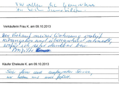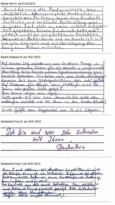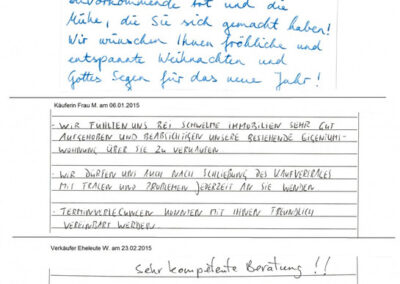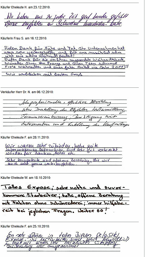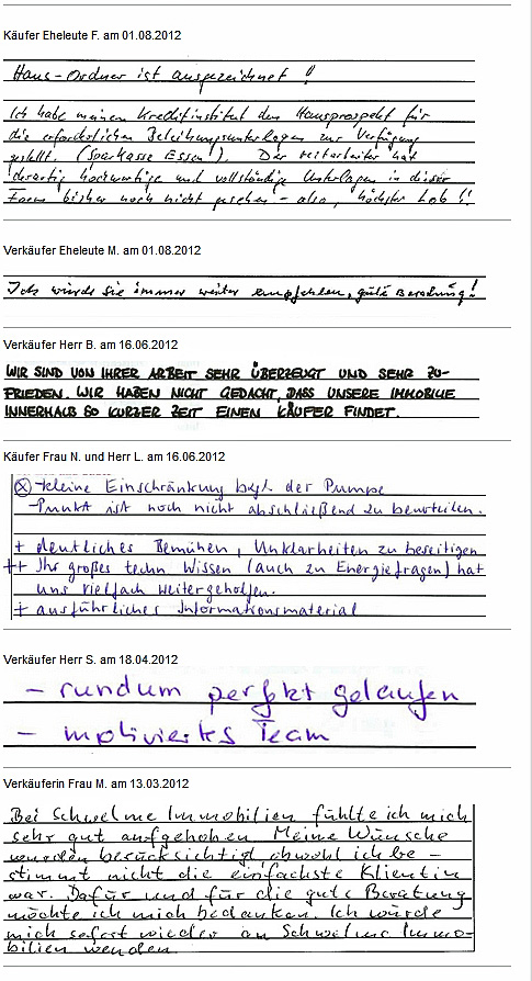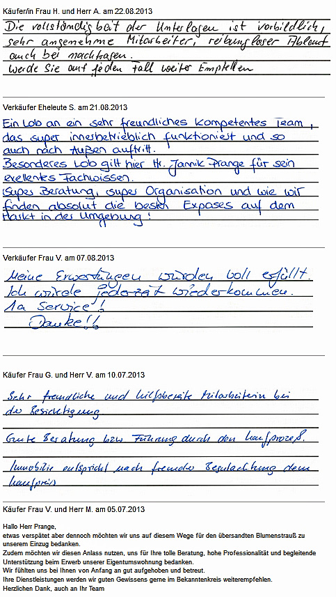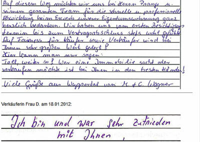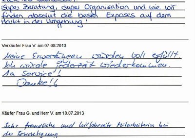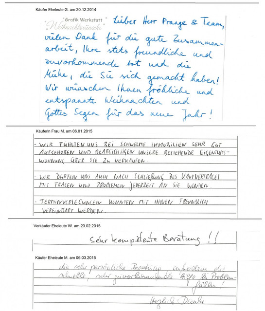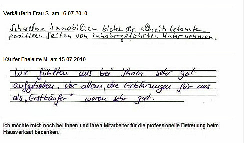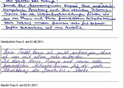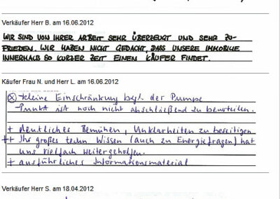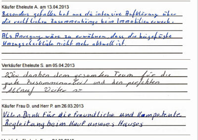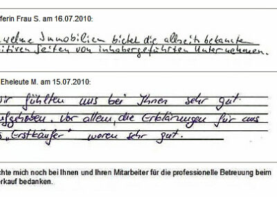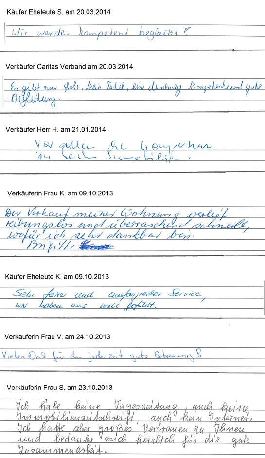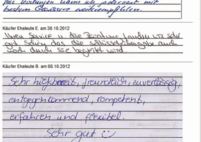 Auch vor der Zeit der Onlinebewertungen haben wir unseren Kunden eine Stimme gegeben. Somit konnten sie jederzeit ihre Erfahrungen mit uns teilen und uns wissen lassen, wie wir unsere Dienstleitung weiter optimieren dürfen. Erhalten Sie hier einen kleinen Einblick in die Rückmeldungen unserer Kunden, die wir bei ihrem Immobilienverkauf bzw. -Kauf begleiten durften.