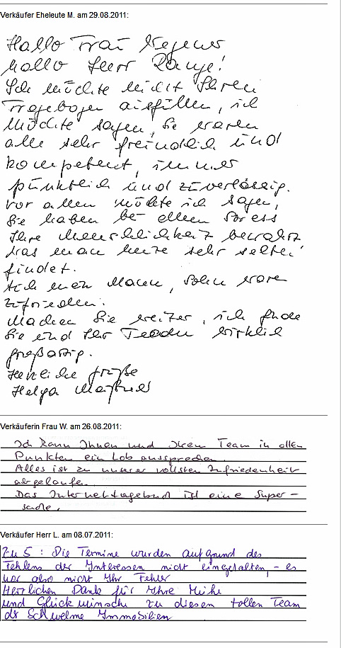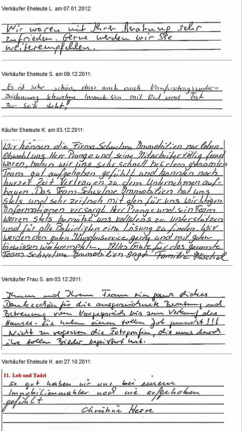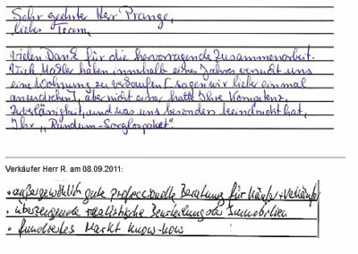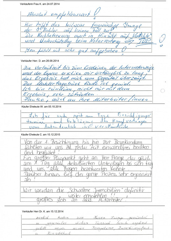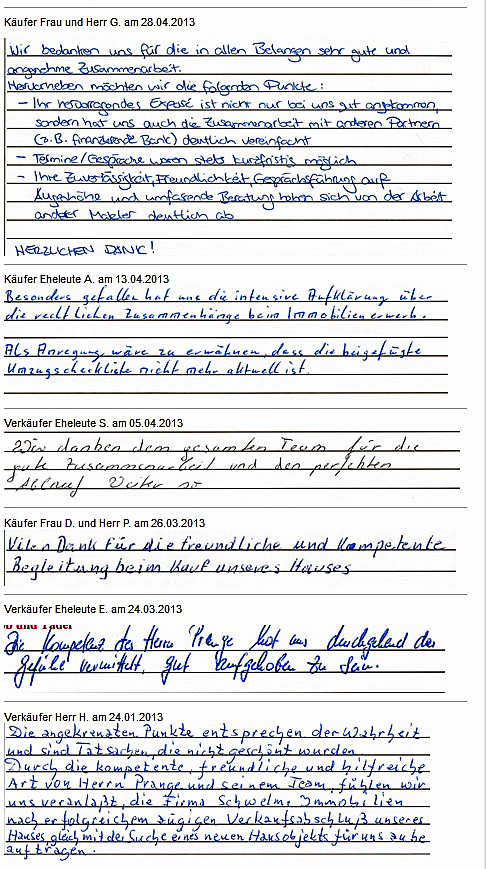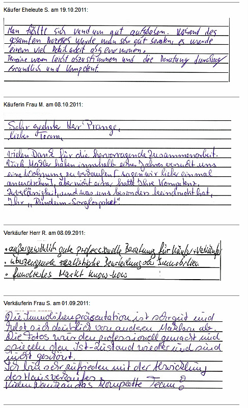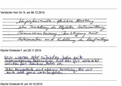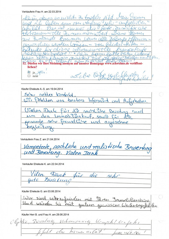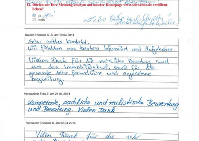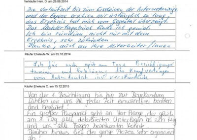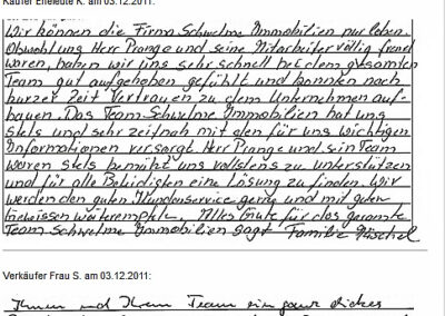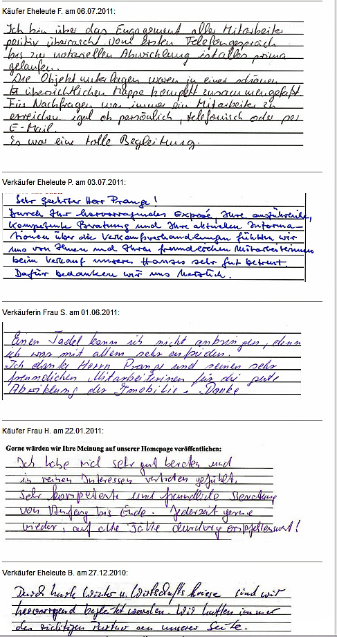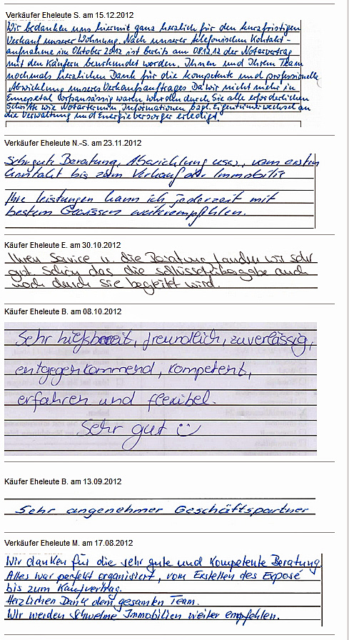 Auch vor der Zeit der Onlinebewertungen haben wir unseren Kunden eine Stimme gegeben. Somit konnten sie jederzeit ihre Erfahrungen mit uns teilen und uns wissen lassen, wie wir unsere Dienstleitung weiter optimieren dürfen. Erhalten Sie hier einen kleinen Einblick in die Rückmeldungen unserer Kunden, die wir bei ihrem Immobilienverkauf bzw. -Kauf begleiten durften.
